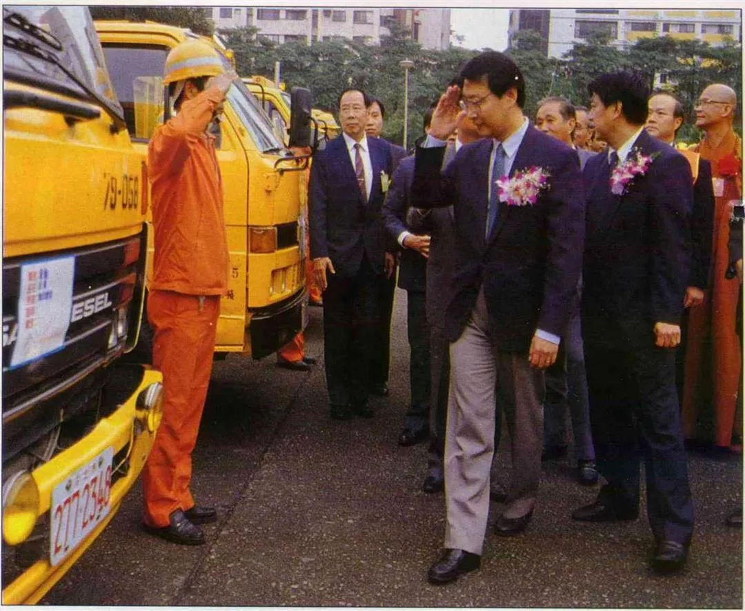 上任不到一年,他對企業和其他行政機構送出不少「環保壓力」,圖為他與台北市政府環保局的垃圾車隊做「第一類接觸」。(鄭元慶)