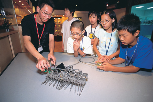 解說員操作多足蜈蚣的步行機器人,讓小朋友了解機器人行走的原理。