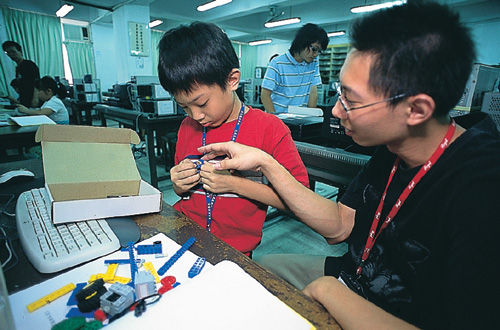 機器人研習營裡,小朋友動手組裝簡易機器人,很有成就感。
