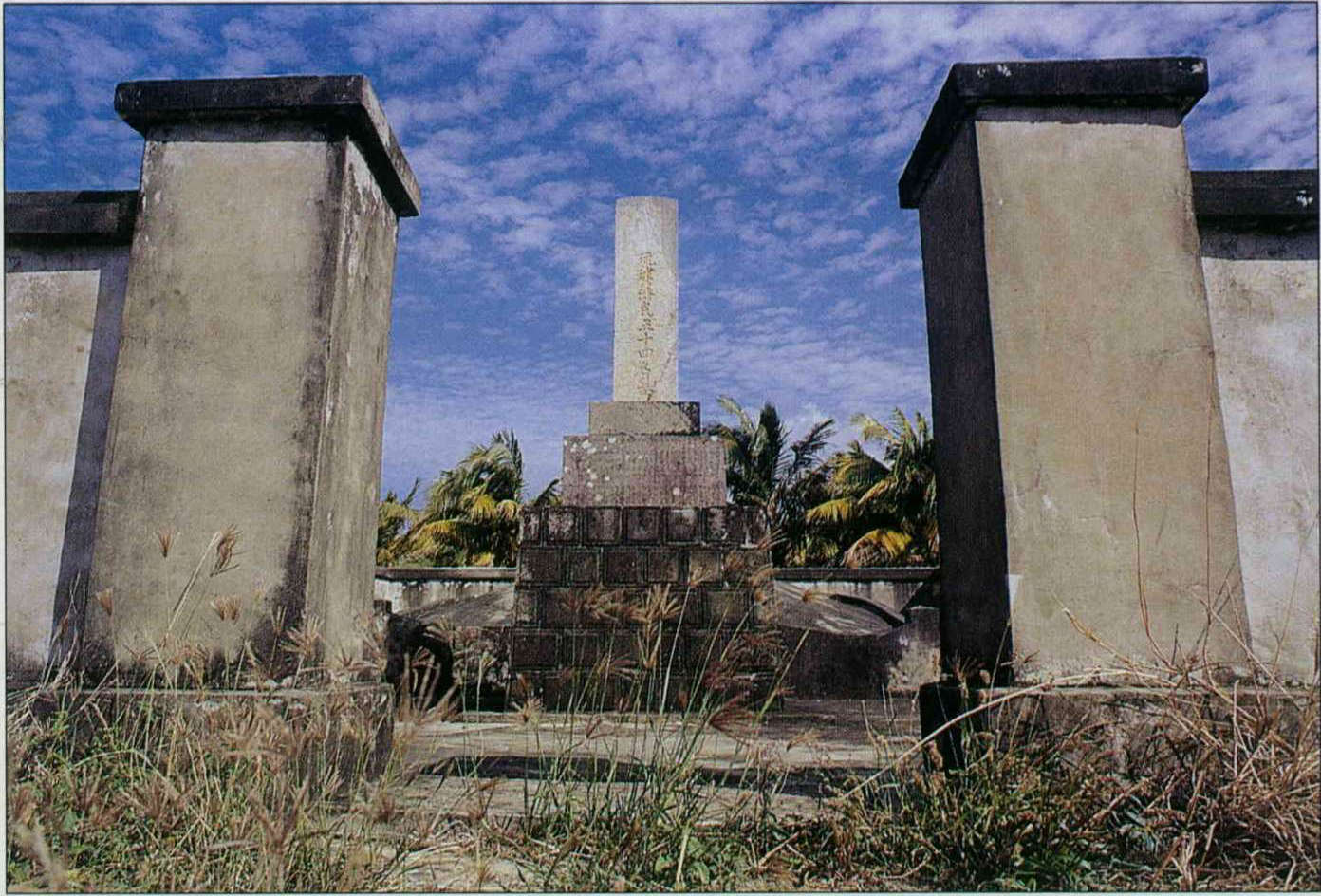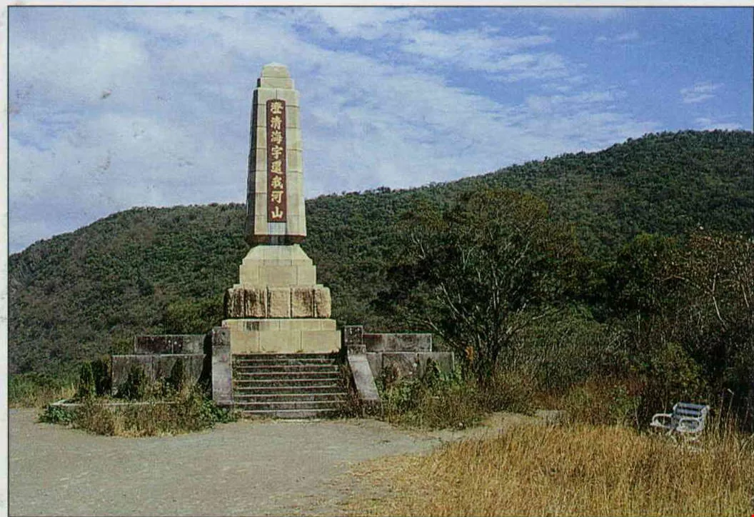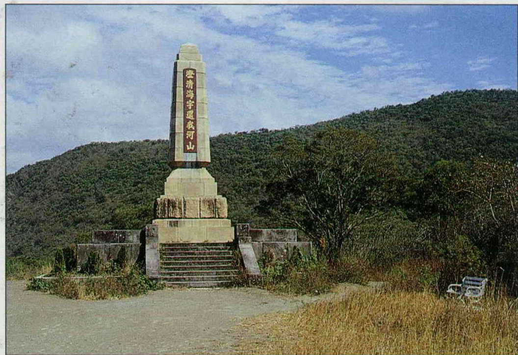 登三百九十四階石梯爬上這座山丘頂,迎面矗立著巨大的紀念碑,上題:「澄清海宇還我河山」。這是台灣光復後豎立的,一旁另有一座斑剝的大塊石碑,已不見字跡,黑黝沈寂,仿如遠古的廢墟。據說是當年日軍統帥西鄉從道豎立的遺碑。