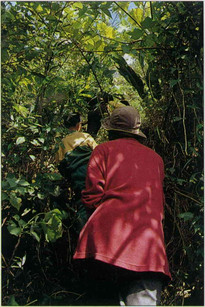 往南仁山石板屋的叢林裏,必須一邊伐草一邊前行,讓人身歷其境地領略到「番山」路的艱辛。(邱瑞金)