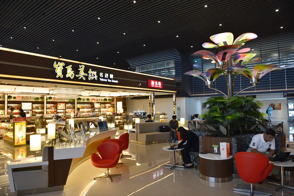 過去這裡幾乎沒有任何休憩設施,旅客只能行色匆匆地快速入關。但經過巧手改裝後,已有星巴克及知名餐廳「四川吳抄手」進駐,還規劃台灣知名農特產品產銷區,除了擺放廣受歡迎的伴手禮鳳梨酥,另有包裝精美的「田中米」禮盒、「戀戀蚵仔寮」海味及關西仙草即溶沖泡粉等深具在地文化特色的商品。