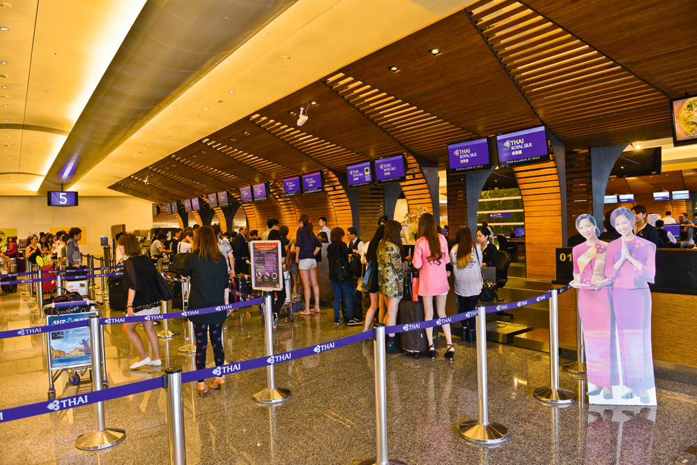 以木質紋為基底的航空公司報到島區,空間加大,推著行李的旅客可從容地排隊等候。