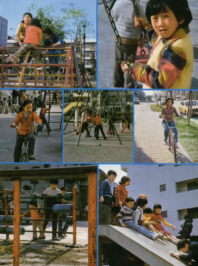 兒童遊樂場中設有各種運動或遊樂器材,諸如:鞦韆、滑梯、單槓、雙槓、爬竿、蹺蹺板、浪木、搖椅等種類繁多,孩子們都喜歡玩到精疲力盡,才肯回家。他們也喜歡在空地上爭逐遊戲:或捉迷藏、或放風箏、或騎單車,足夠的活動空間使孩子們可以快樂無憂地在一起玩,也在一起學習,這對他們的身心發育,都是很有利的。