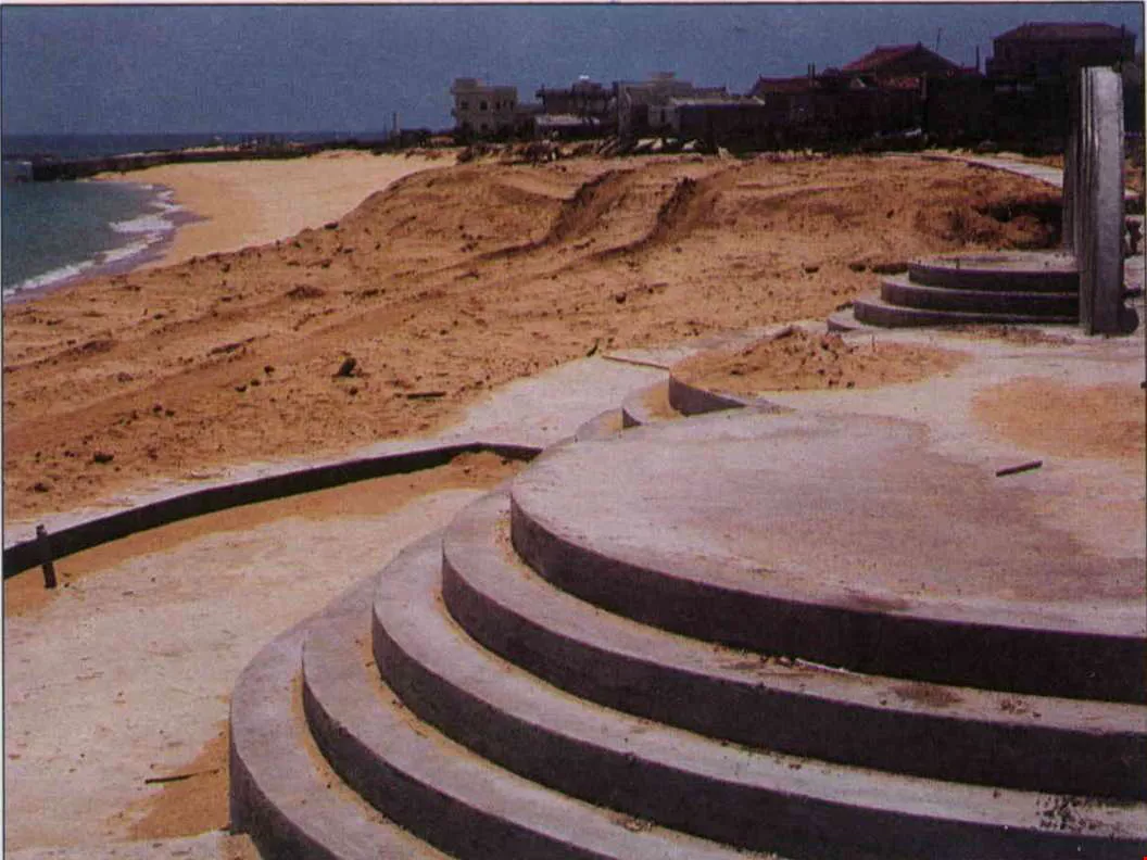 觀光局沿著沙灘築起水泥步道與涼亭等建物。沙灘被一分為二,綠蠵龜是否還願上岸?(南岳攝)