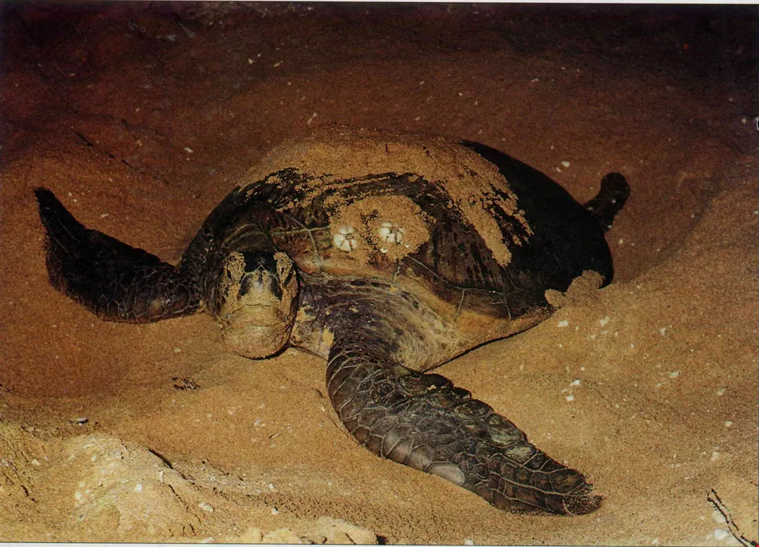 重可達三百磅的綠蠵龜,除繁殖期,平日生活於大海,途中上岸產卵的母龜,身上已附生貝類。(葉銘源)