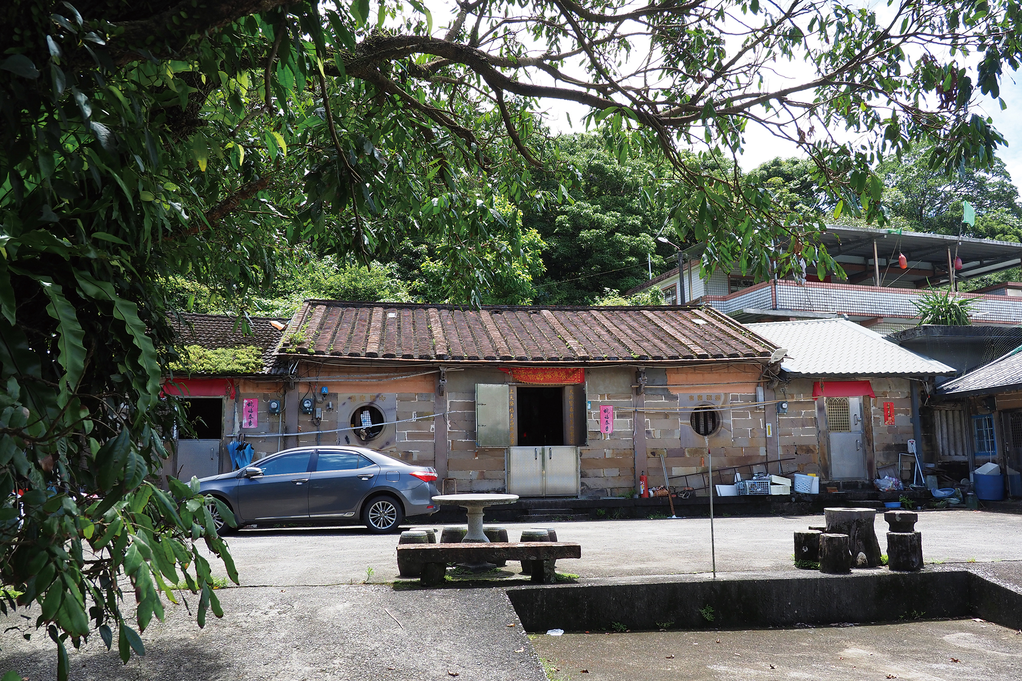 昔日的河運雖已不再,建築地景仍見證了繁華。聚落的百年古井旁,聳立著一座完整漂亮的石材三合院「吳家大宅」。吳函恩解釋,長達兩、三公尺的地基石條,使用的是壓艙石,見證大戶人家早年船運貿易的經濟實力,也是龍門開墾史的印記。在龍門的巷弄間,還有一種特殊的「砂礔厝」,是早期居民取雙溪河的沉積砂岩砌成,具有耐風防水的優點,是充滿在地特色的建築。