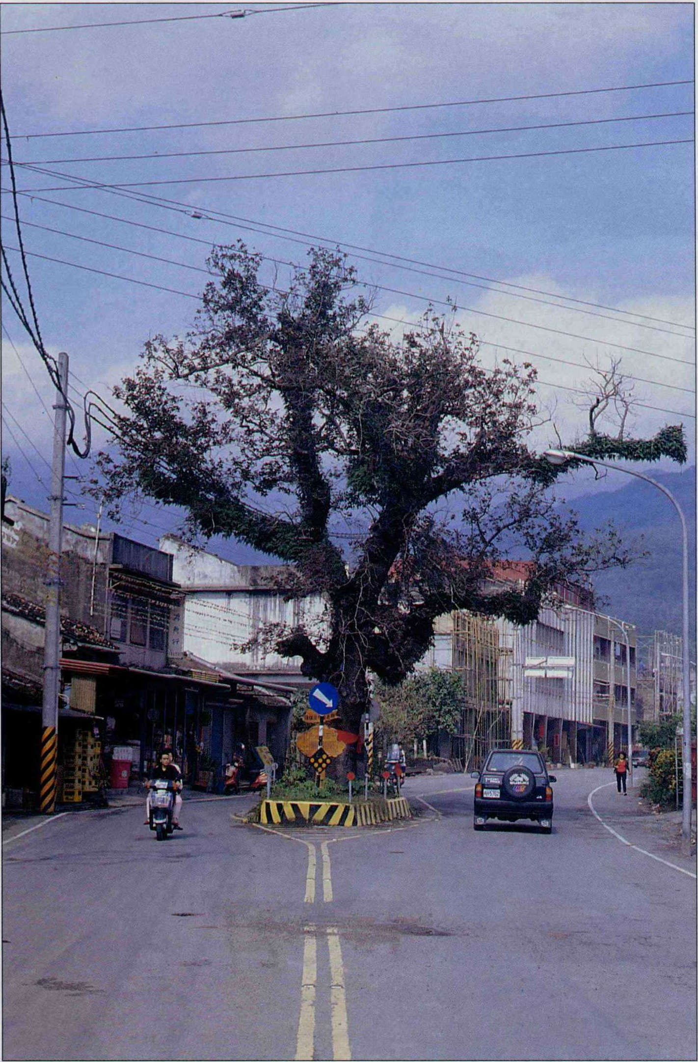 宜蘭礁溪一棵被包夾在道路中央的楓香,大樹雖被刀下留情,卻被留的很突兀、醜陋,就如卡在高架橋下的台北北門。(卜華志攝)