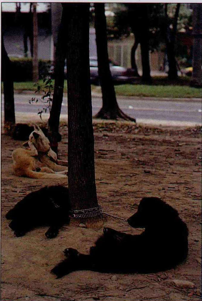 「咱倆可真是同病相憐」,狗、樹都被捆著,兩者卻一樣無辜。(邱瑞金)