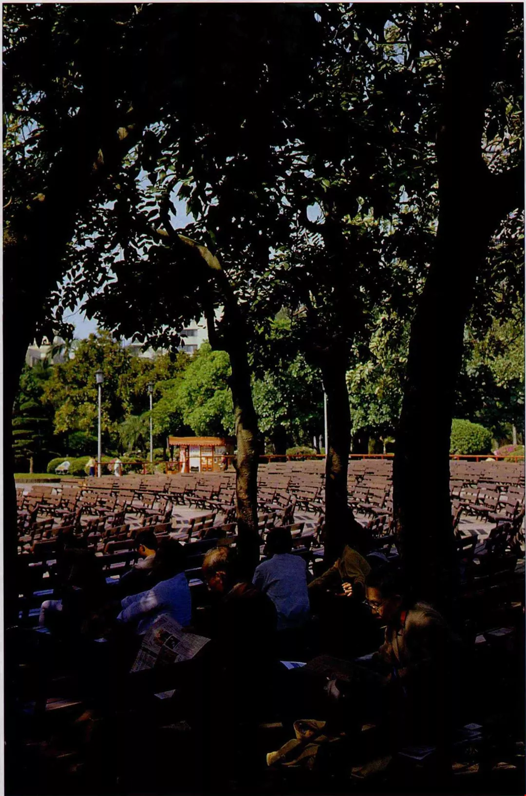 樹蔭底下看報、乘涼,再熱的天氣也不怕。(邱瑞金)