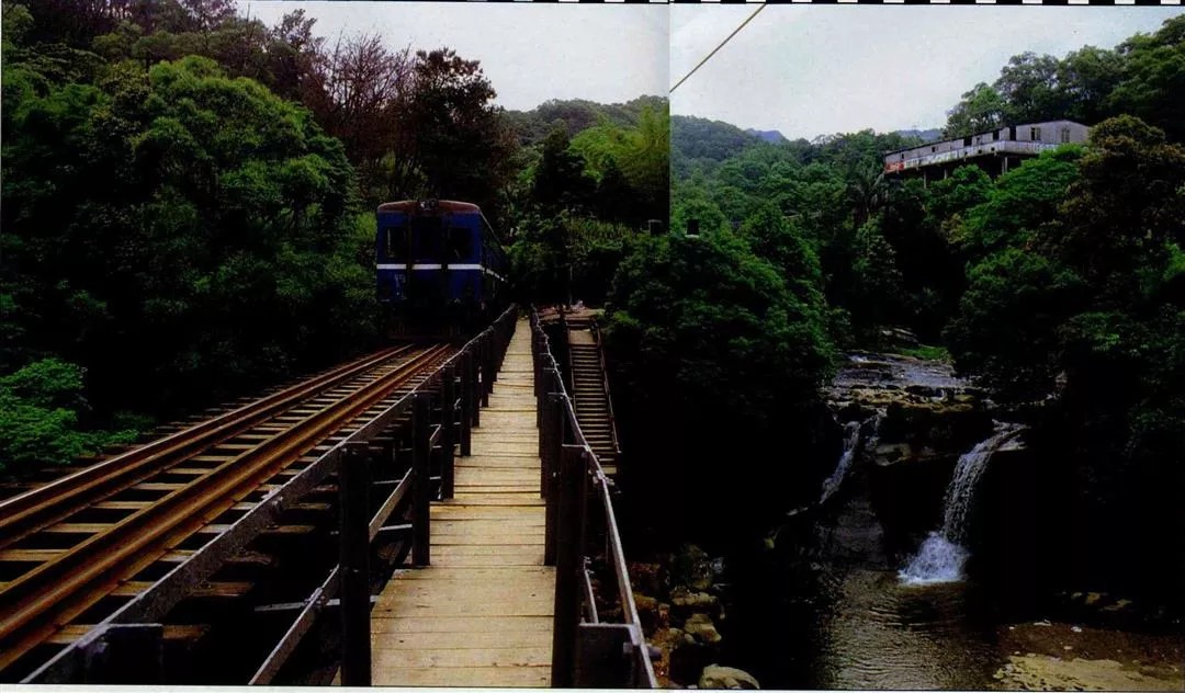 穿過高山,渡過小溪,火車帶著我們看到基隆河谷因斷層落差形成的「眼鏡洞」。