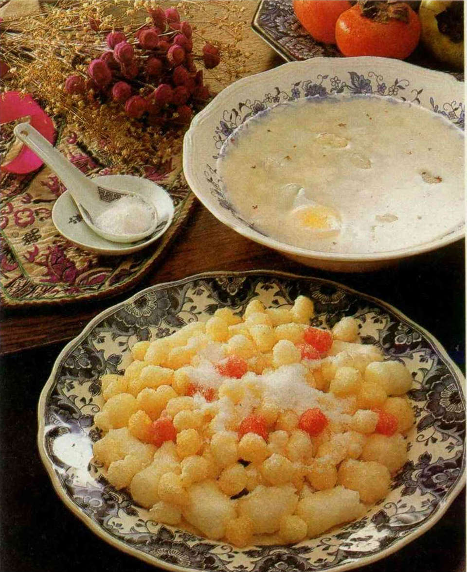 7.各式元宵和圓仔除煮食外,也可風至七分乾或沾裹糯米,以七分熱油炸至焦黃,撈起去油而食(手搖湯圓不可風乾,免得炸破外皮),淋以蜂蜜、綿糖,或入羹湯,風味極佳。
