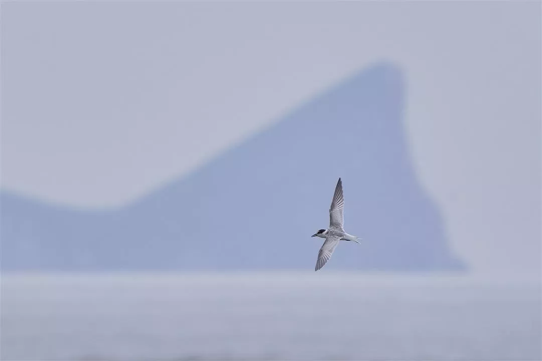 展翅翱翔的小燕鷗與龜山島相互輝映。(宜蘭縣野鳥學會提供)
