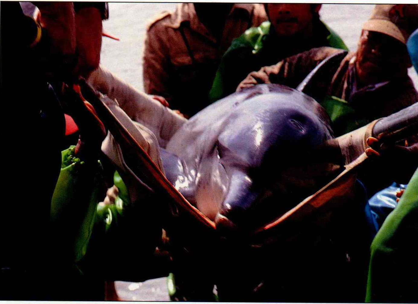 「海豚被漁民先以小刀割喉,並以鋼筋刺傷口。棄置一旁二、三小時,再拖上舢舨,用小刀環切斷頭,小刀切及頸動脈時,這頭『假殺人鯨』在大出血中掙扎跳回海中,染紅海水,久久不消。」