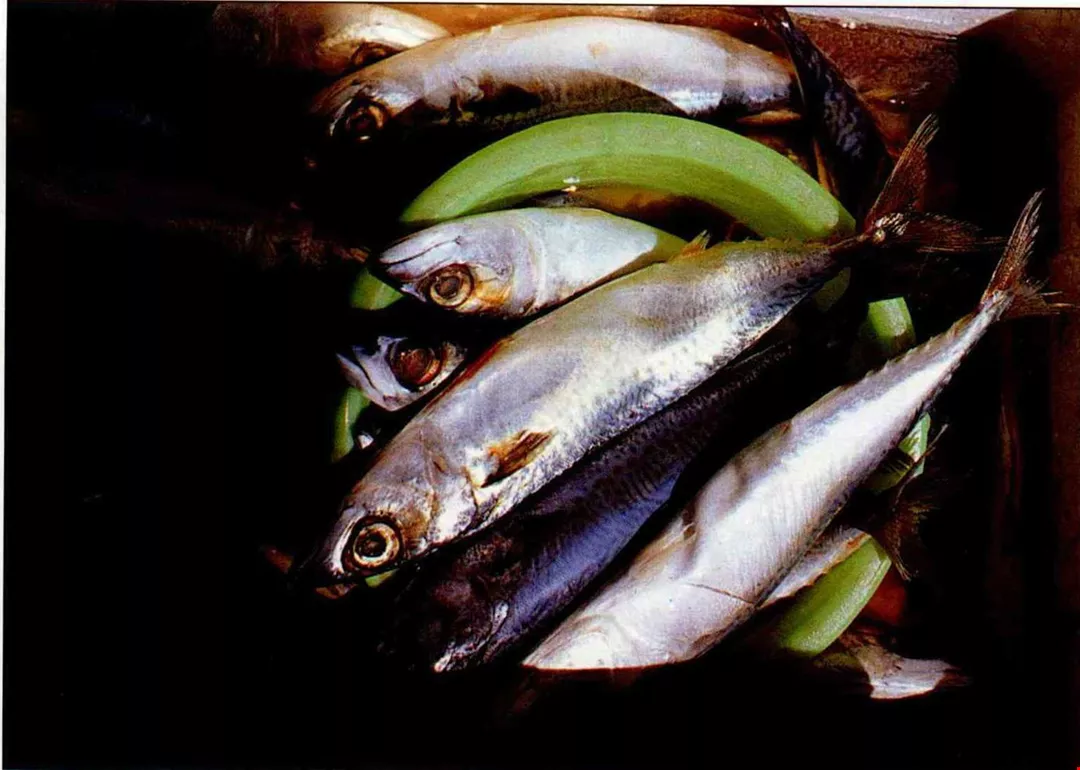 準備用來給遊客餵養海豚的鯖魚,因正值人潮稀少的淡季,放在室溫過久,發出陣陣腥臭味。(張良綱)