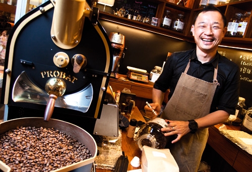 熟練地操作由德國進口的近70萬元烘豆機,站在透明玻璃後的他,一勺一勺舀起褐色豆子,查看成色、香氣,眼睛卻沒忘了觀察店內一切。店員準備餐點忘了招呼客人時,他一定帶頭高聲喊著「謝謝光臨」。