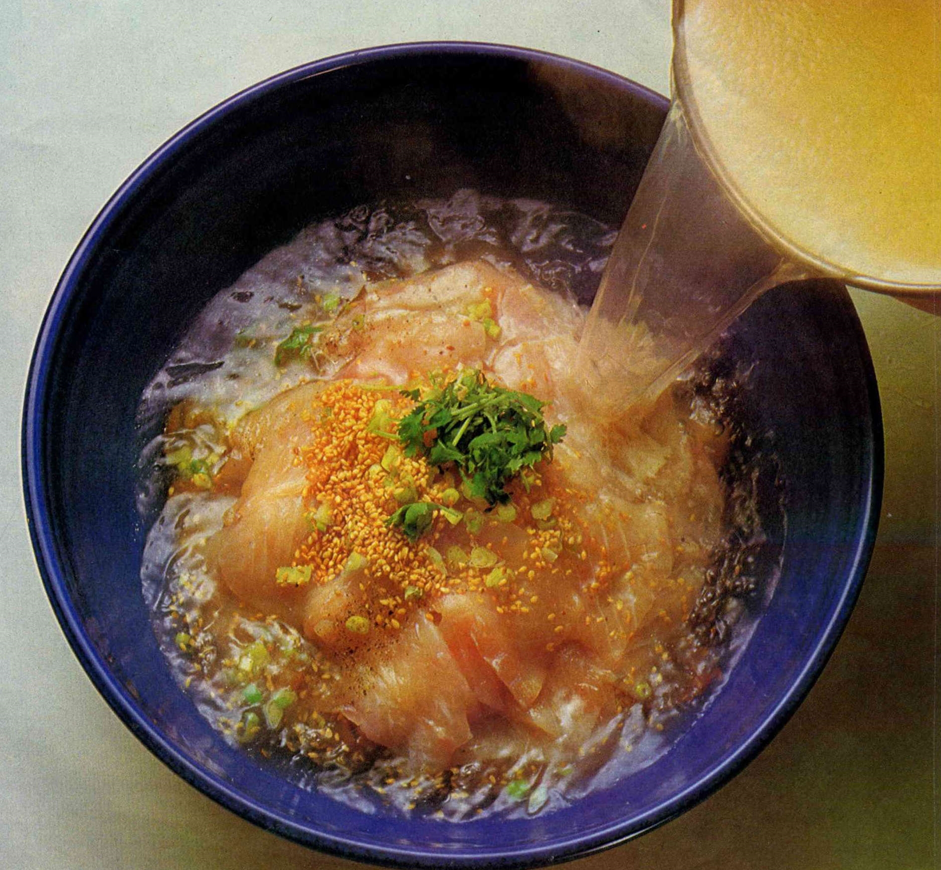 這是一道著名的湖南湯菜,在餐桌上臨食時現場表演,十分別緻。材料不限定用魚生(生魚片),也可改用鴨脯、鴿肉或羊肚等,但魚生比較容易買到,而且經濟。通常是購買一條小一點的淡水活魚(如鯉魚、草魚),臨烹調時殺剖,先切下頭、尾另作他途,只留中段由背部片開,去掉大骨及魚皮,僅取用雪白的魚肉部分。順魚肉直絲片切成一寸半長、一寸寬的薄片,愈薄愈好,如遇多刺處,可剔下一厚片不用。在一隻大碗內,先裝約一杯量的生菜絲(或生豆苗、燙過的菠菜心、西洋菜等皆可),然後將片切及炸酥的油條放在上面,最後將生魚片一片片攤平鋪在油條上,撒下蔥花及香菜少許,並淋下醋一茶匙及胡椒粉、麻油各少許,便可整碗端到餐桌上。另外將上好的雞湯一大碗在小鍋內煮滾加鹽調味後,趁其沸滾時迅速澆到大碗內的生魚片上(用大湯勺壓住防其浮起)。待生魚片均已燙熟,即可攪拌,並分盛小湯碗內供食。