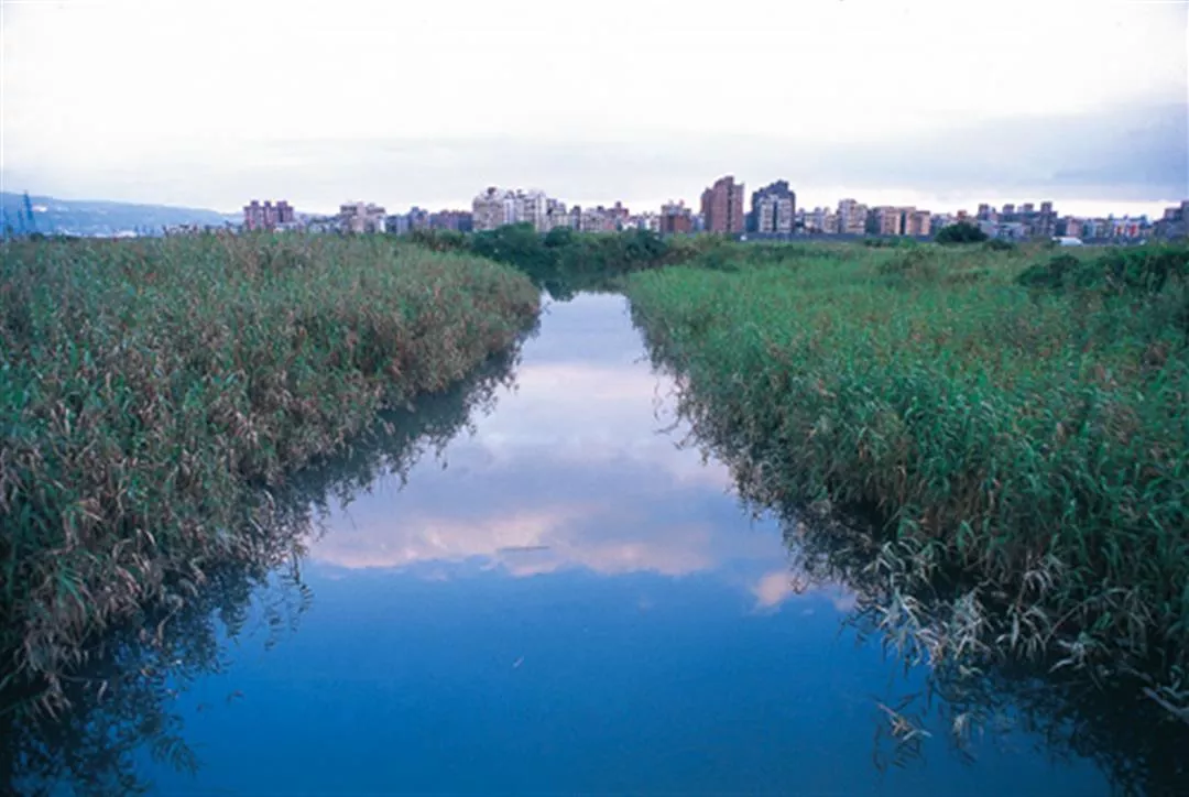 一片遼闊綠地映入眼簾,寬約400公尺,長度看不到盡頭,在平坦綠地的左側堤防後面,卻是櫛比鱗次的高樓大廈,原來濕地所在正位於二重疏洪道中。