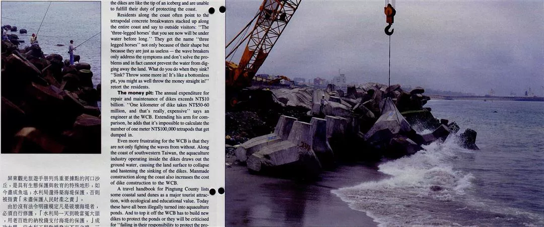 海堤疲態畢露,副作用與日俱增,「證明了人定勝天有其極限」,水利局處長許時雄說,每年大修、全面翻新「萬里長城」般的海堤,往往是做白工,圍堵政策已使水利局吃盡苦頭;灑錢築海堤的觀念,也到須要翻修的時候了。