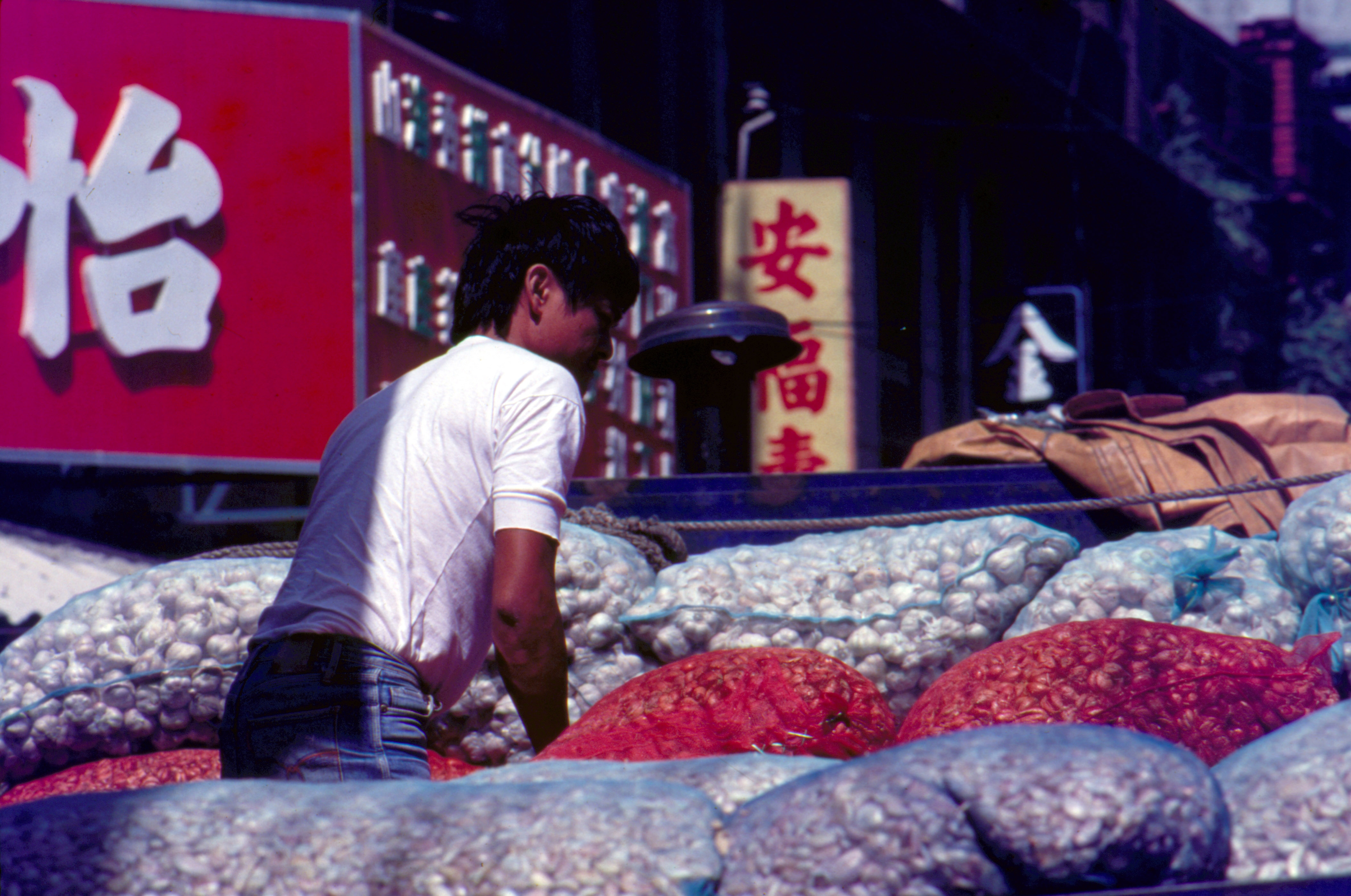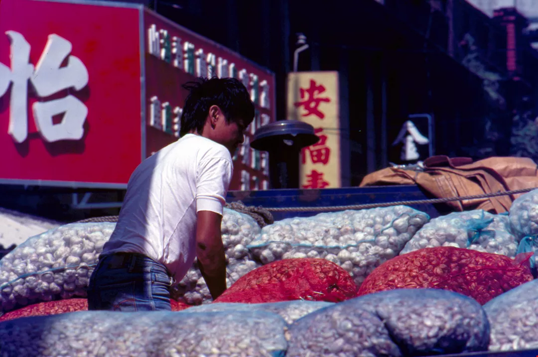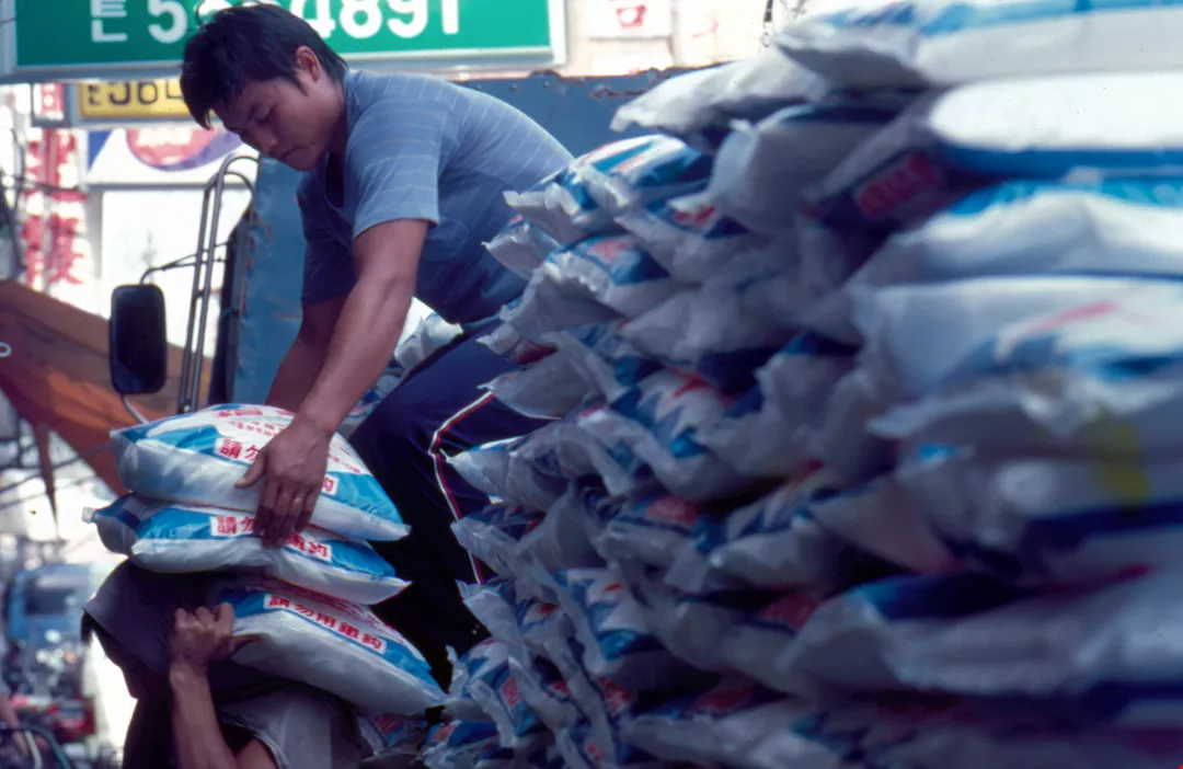 圖3.5:鹽、蒜頭,是迪化街的重要批發品,店員正忙著將貨物卸下。(鐘永和/楊永山)