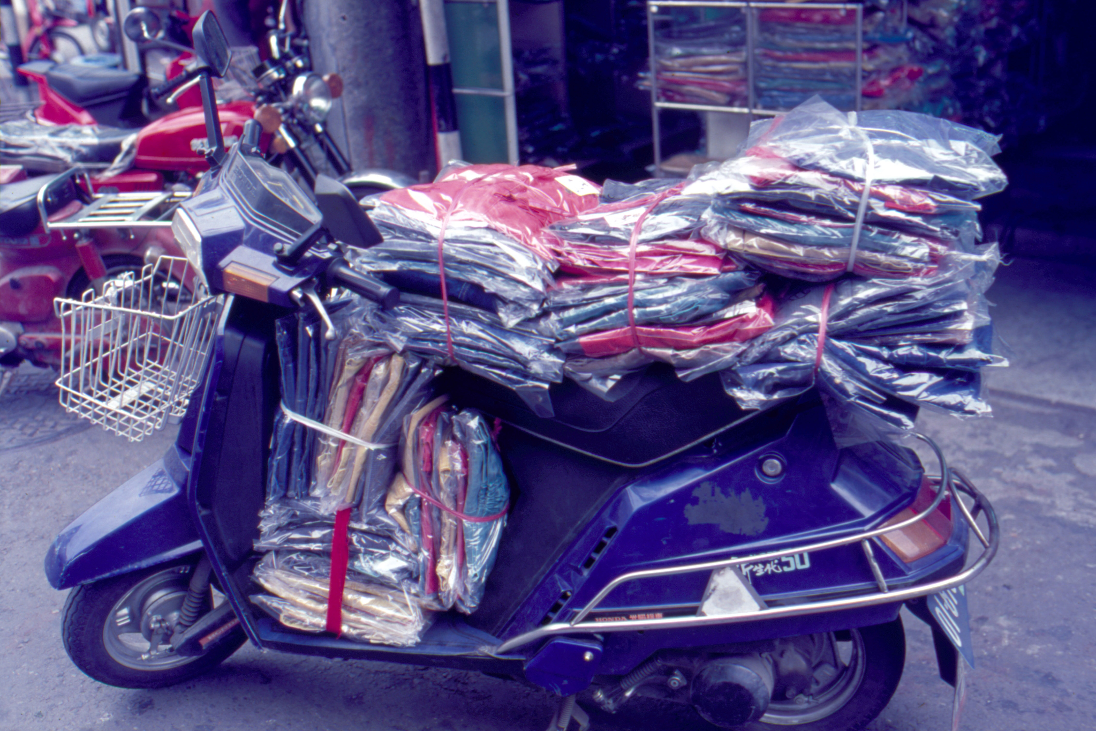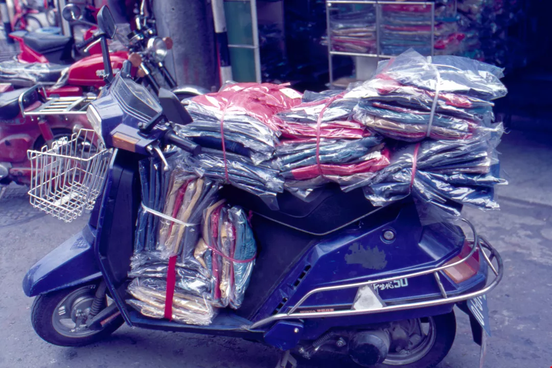 他們肩上背個大袋子,有的一頭鑽進某店中,就像回到家一樣,倒水、取貨,樣樣自己動手;有的一家看過一家,精挑細選,這兒5件、那兒10件地買;也有的乾脆俐落,看中了什麼式樣,三言二語就談成交易,拿了貨就走;……從布袋隆起的程度、及扛在背上的分量,可看出他們當天採購的成果。