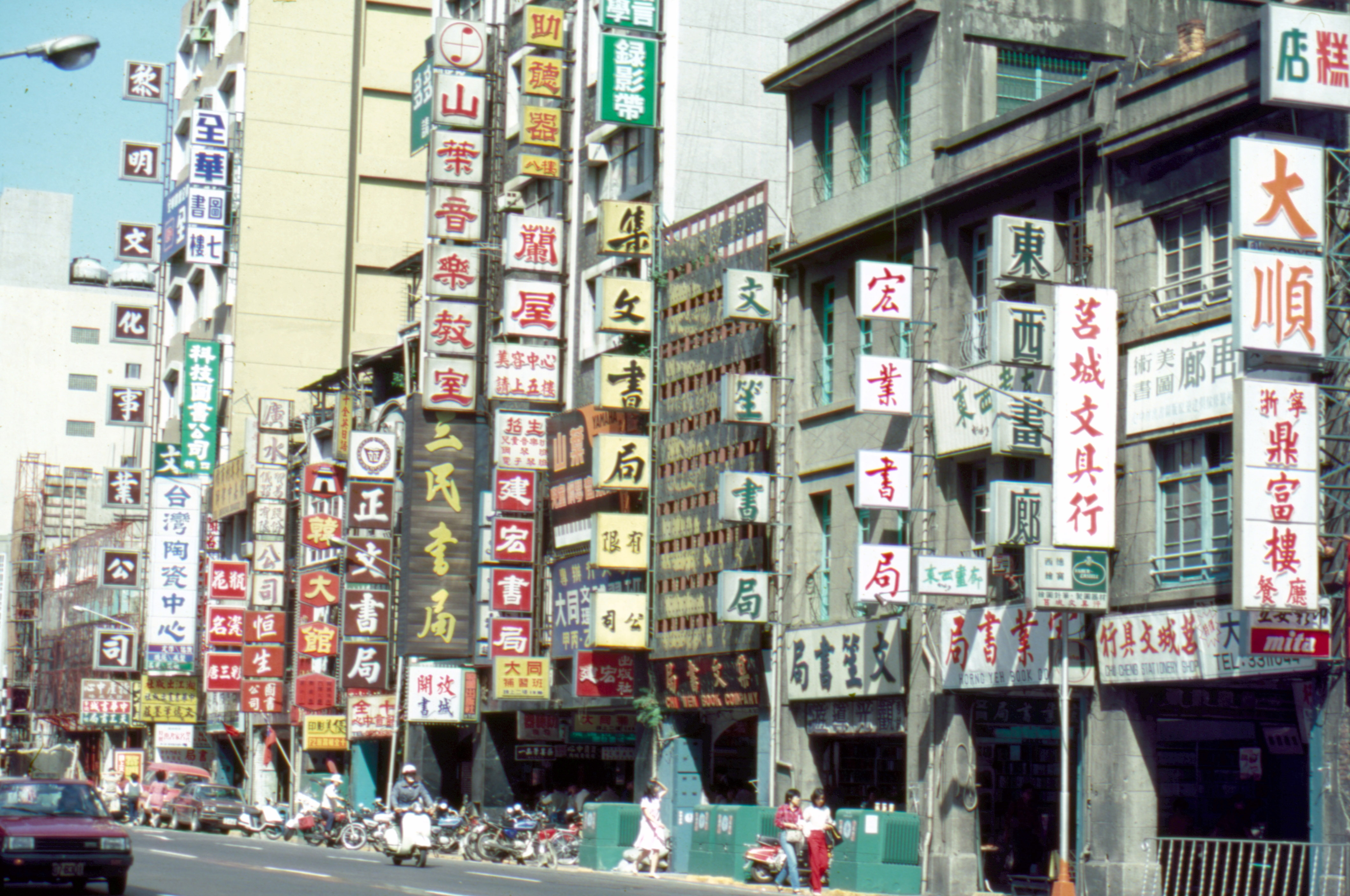 在忠孝西路口到寶慶路口間的重慶南路,大大小小的書店櫛比鄰次地列在兩旁。書店裏的寧靜和書香,與屋外車水馬龍的喧鬧,成為強烈的對比。