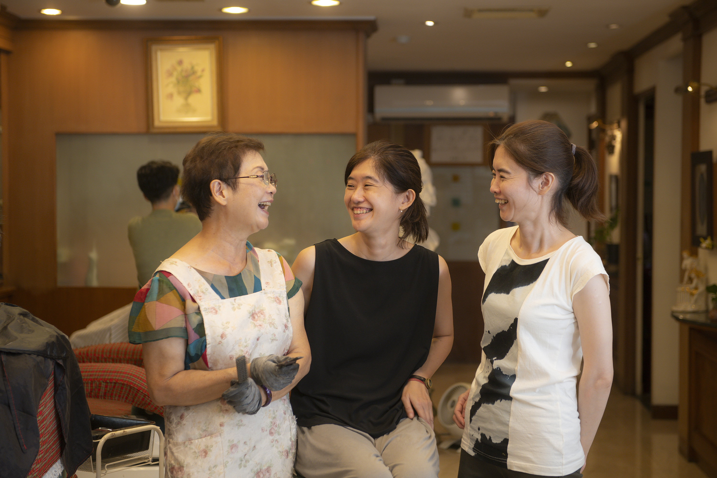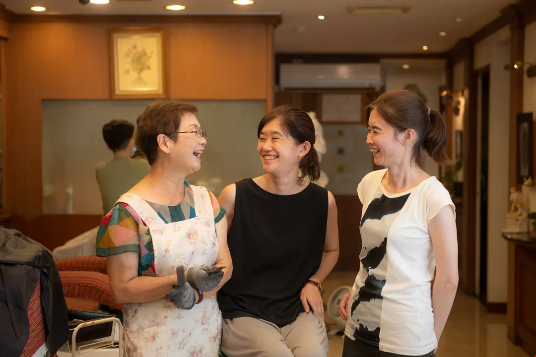 黃碧霞(左)創辦華谷理容院,拉拔孩子長大,二女兒曾怡嘉(右)承襲理髮手藝,三女兒曾敬淳(中)推廣理容院的城市漫遊,一起開創新局。