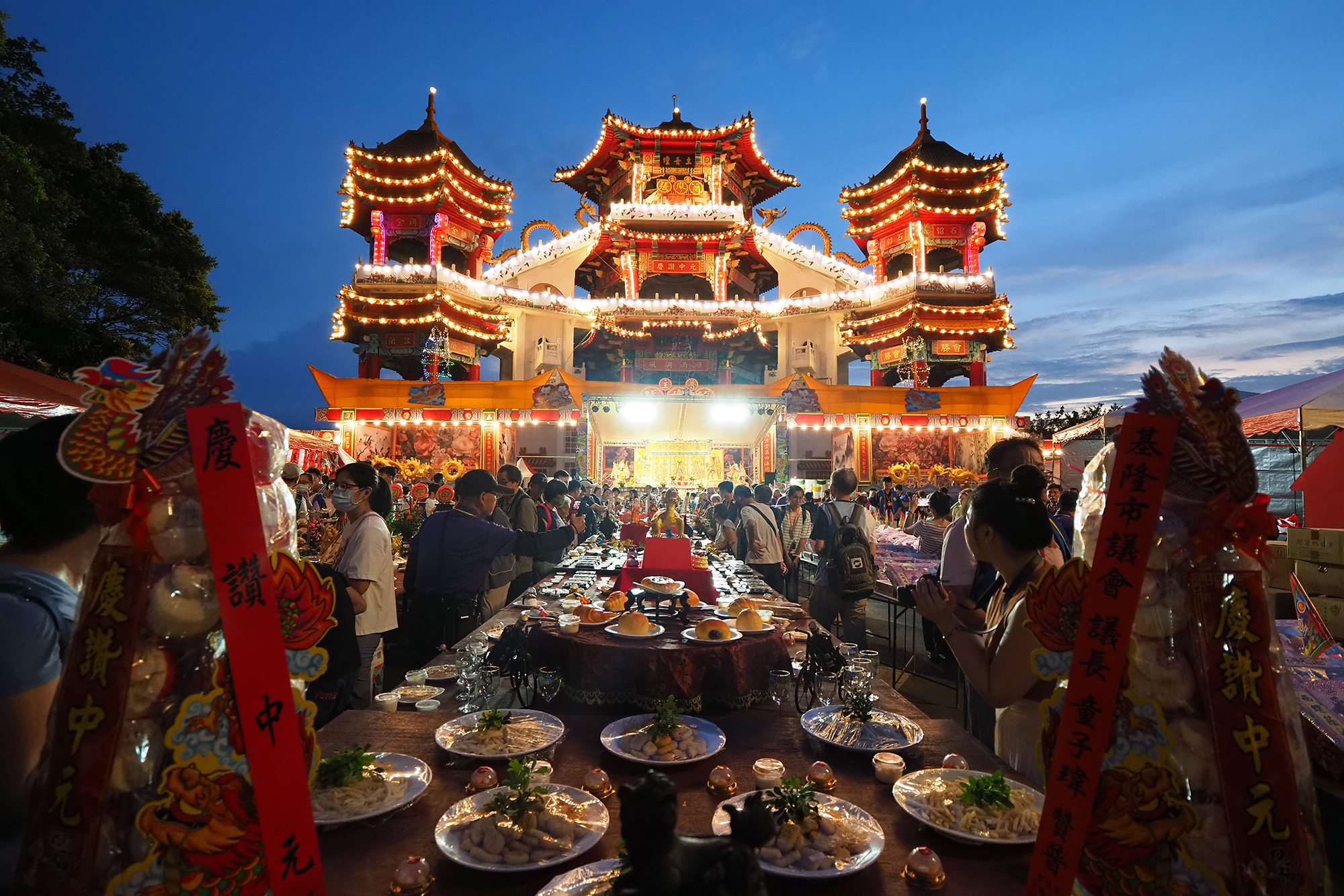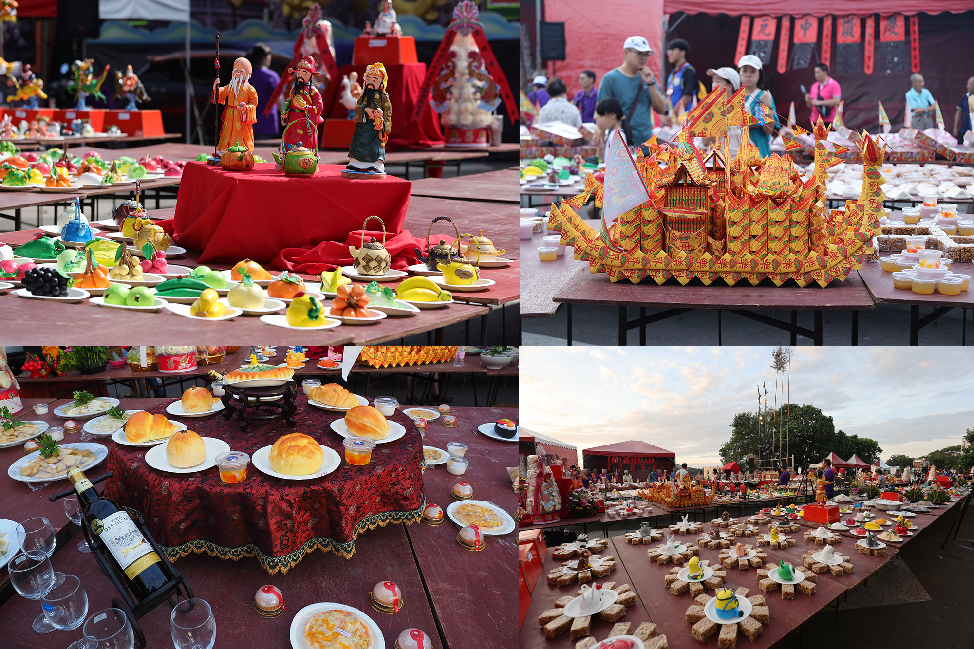 來到農曆十五日,主普壇席開五列長桌,有非當值宗親會的「贊普」,還有當年度主普宗親的「主普」宴席,分為葷、素和西洋三大桌,擺放方式細緻又豪華。