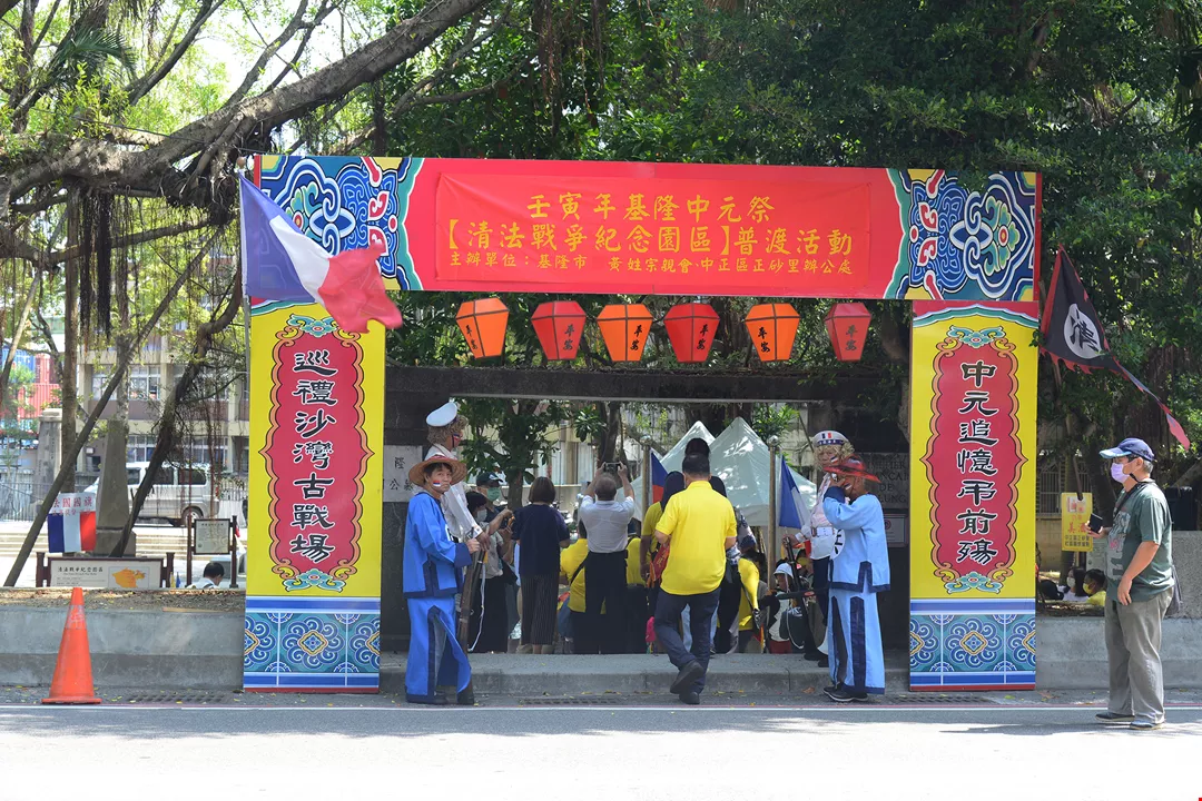 穿著清朝、法軍衣服的裝扮者,在法國公墓迎接與會來賓,是每年法國公墓普度活動的特色。圖為2022年法國公墓普度活動。(張廖簡宗親會提供,張晉超攝)