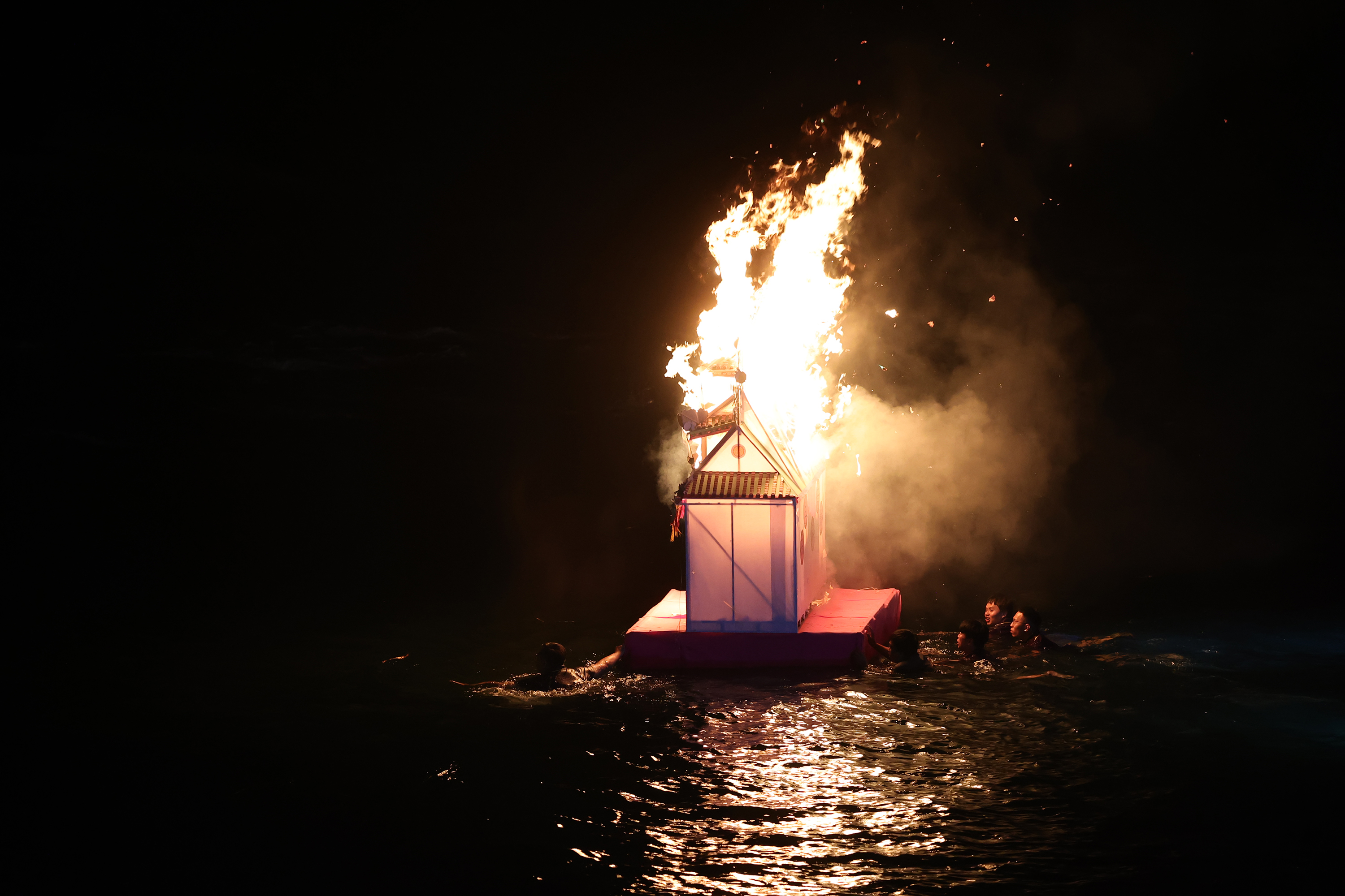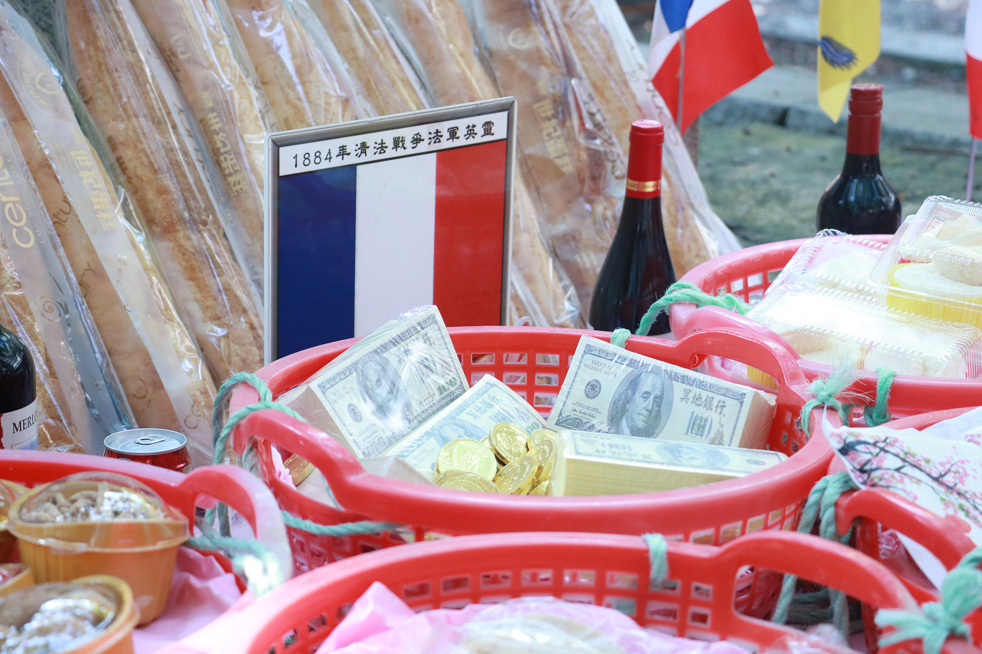 吃不慣東方料理的異鄉好兄弟,可在「西洋桌」得其所好。有牛排、紅酒、咖啡、蛋糕、生魚片、味噌湯和軍艦壽司等等,更貼心附上刀叉,方便他們享用。吃完,一旁還有「沐浴亭」、「翰林院」、「同歸所」,以及儀式中焚燒「經衣」,提供前來享受普度的好兄弟們生活所需。
