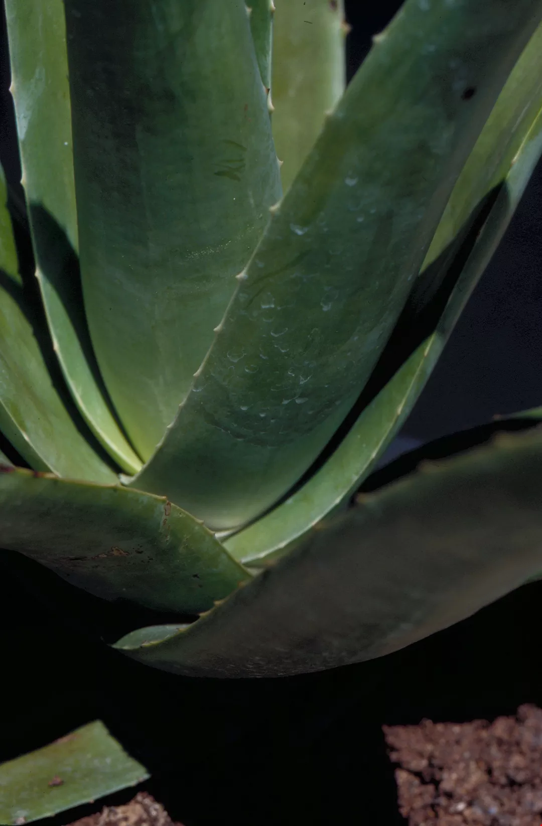 如果用刀把蘆薈葉片切開,裏面是透明晶亮的膠質果肉,好像果凍,會滲出黏稠透明的汁液,據說有神奇的效果。因此「貌不驚人」的蘆薈,成為現代人的新寵。
