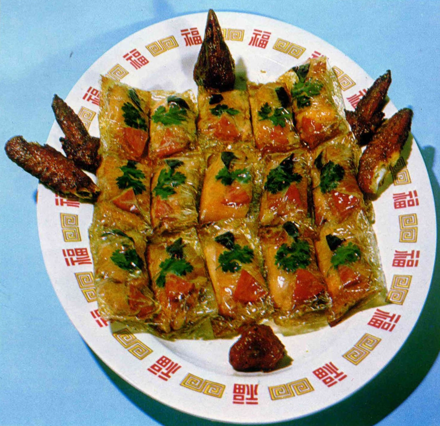 買雞肉12兩(一磅),胸肉或腿肉,連皮切成一寸寬兩寸長之大片14片,用醬油、糖、鹽、酒、胡椒醃15分鐘。香菇、火腿切成三角形的小片。將玻璃紙(每張約五寸,四方形)先在中央刷少許麻油,放上一片香菜葉,左右各放一片火腿及香茹,然後覆上一片雞肉,(皮向下)包成長方形小包,餘下之紙端折向內部夾住。將油燒至八分熱後,投下紙包(正面投下)中火慢炸,約二分鐘,見雞肉變白夠熟,即可撈出瀝乾,排入盤內。即好。