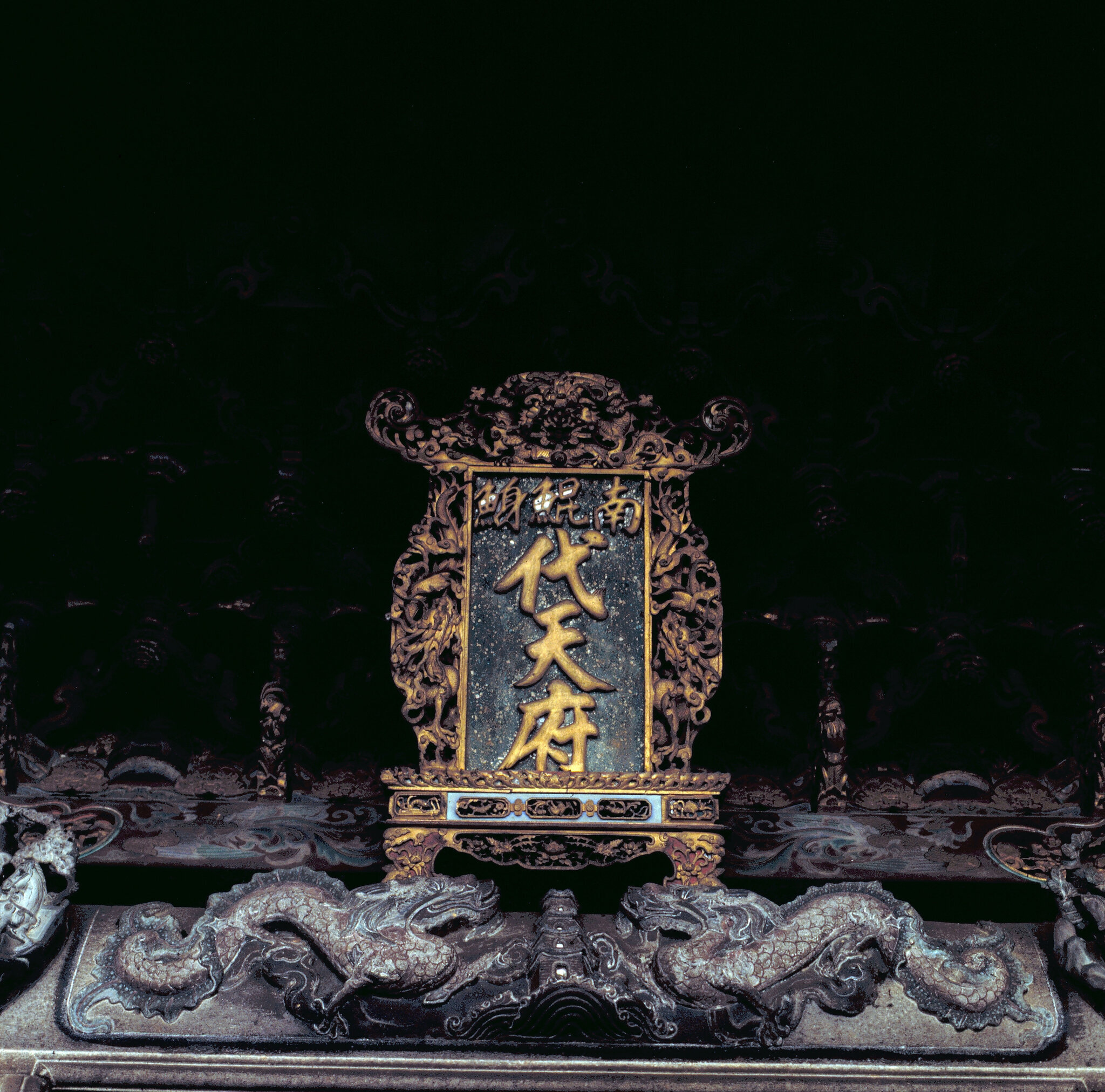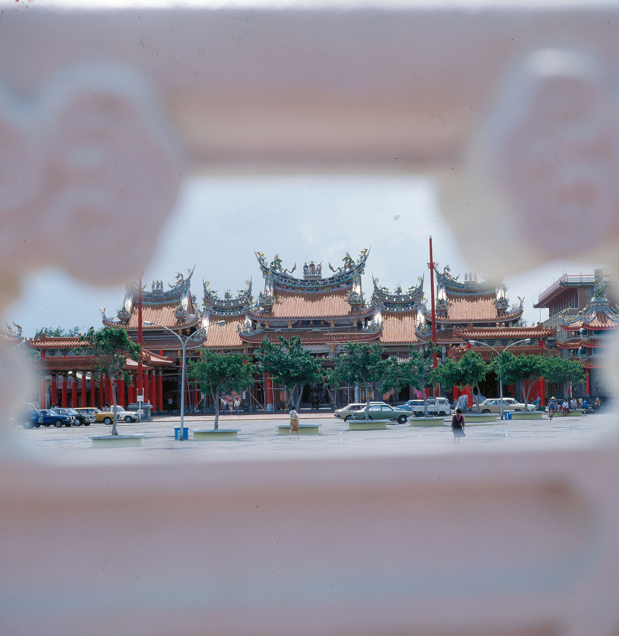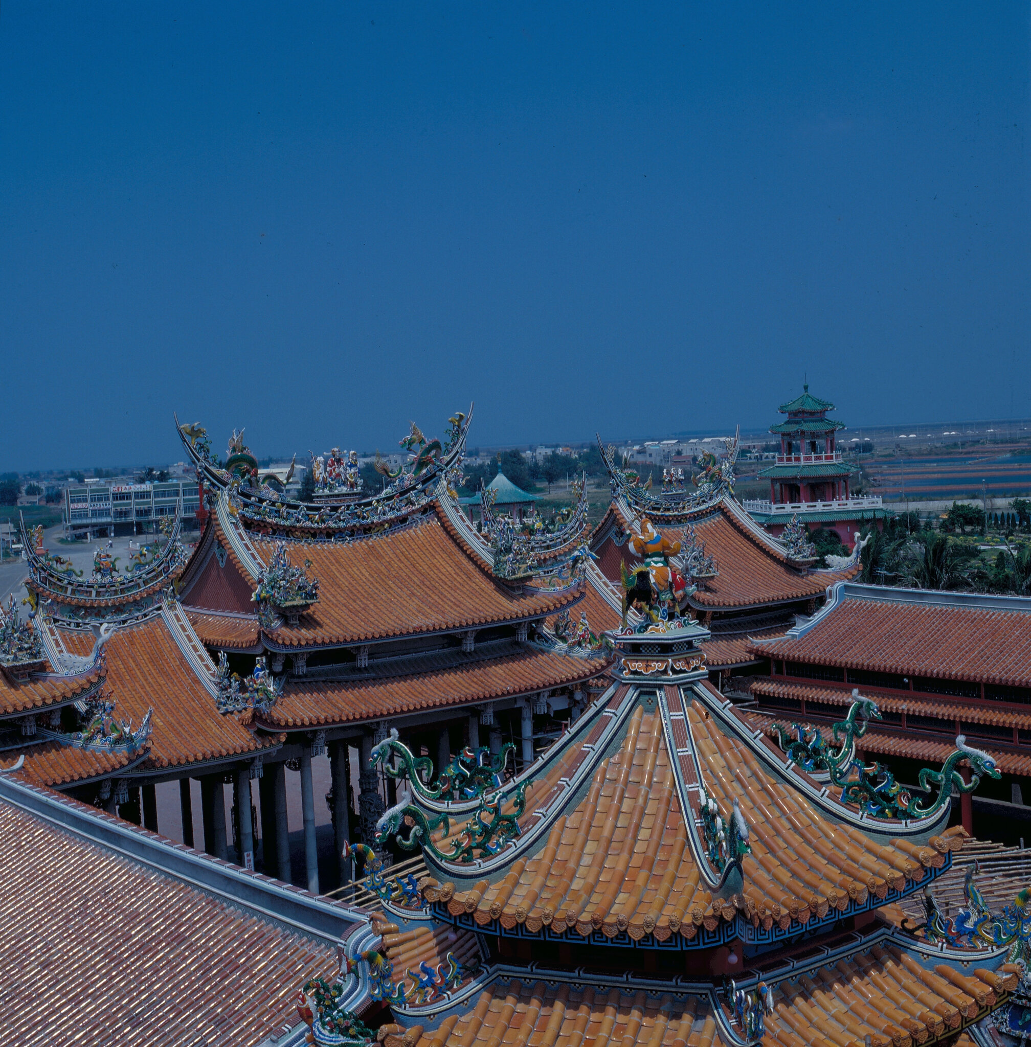 從庭前望整座廟,可見此廟是由三個單位組成,中間是代天府,右邊是中軍府,左邊是城隍衙。廟頂屋簷裝飾華麗,鳳凰、飛龍在屋頂上神氣昂立。