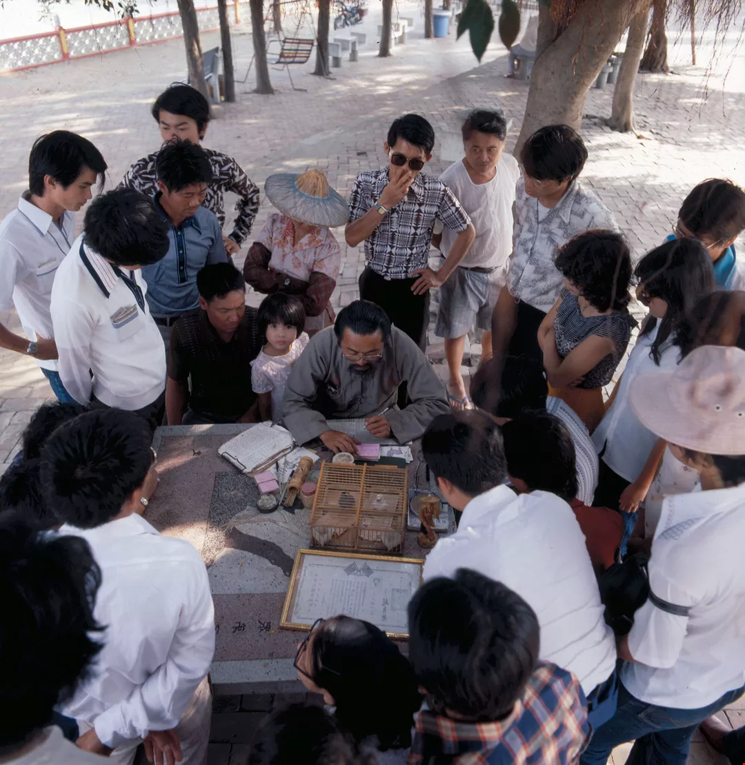 一位算命先生在「虎苑花園」裡做生意,一襲長袍加上各式道具,引來許多遊客圍觀。