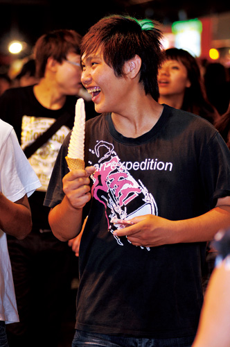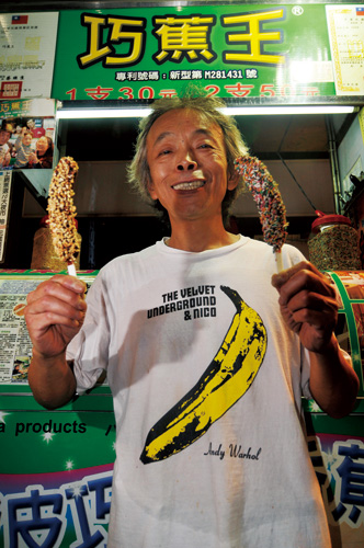 隔幾攤的「巧蕉王」則打出「有專利」的招牌,凍成冰棒的香蕉,先裹上一層巧克力醬,再沾上花生碎粒或彩色糖粒,就像吃雪糕一樣外甜內脆。