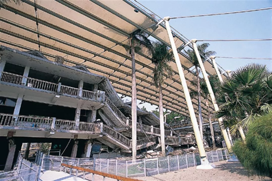 地震後傾倒的3層樓北棟教室,經過強化內部構造後,也在天空搭起薄膜,並以鋼索連結對面的墩柱;原本連結南、北教室的一條空中走廊,在震後整個塌陷、被壓縮成三明治狀,根本無路進出,建築師靈機一動,從走廊中間垂直「鋸」出一條小路,如今遊客可站在走廊前,目睹左右兩側走道、被壓縮的切面痕跡,藉此想像當時地震的強大力道。