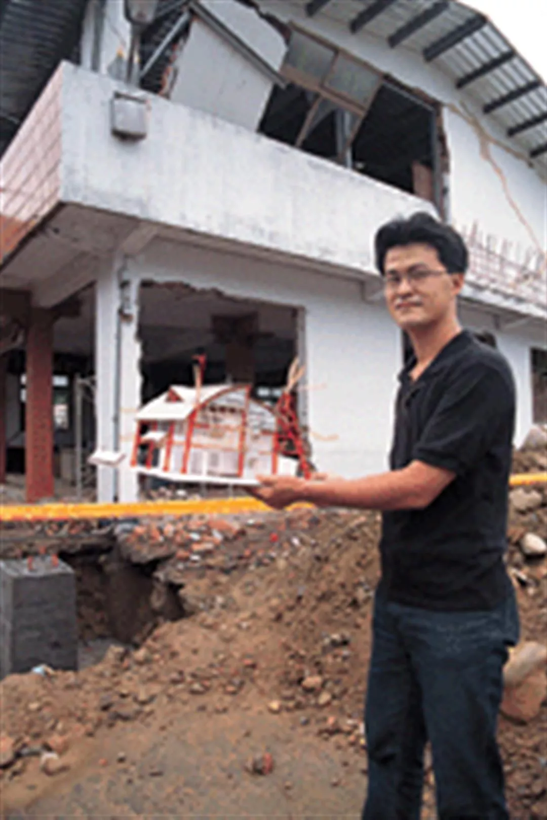 預計在十月中旬完成的「桃米震災紀念館」,將遭地震破壞的福同宮活動中心整棟保留,再以新結構拉舊結構,維護安全。手持紀念館模型者為設計師陳惠民。
