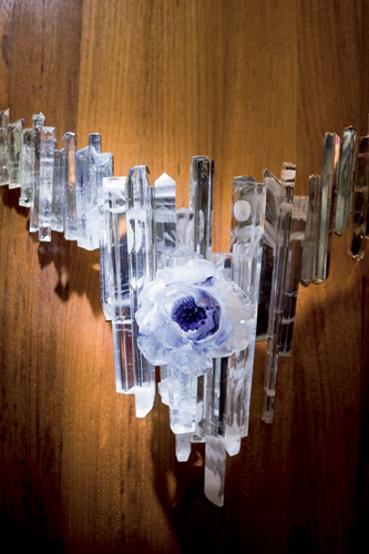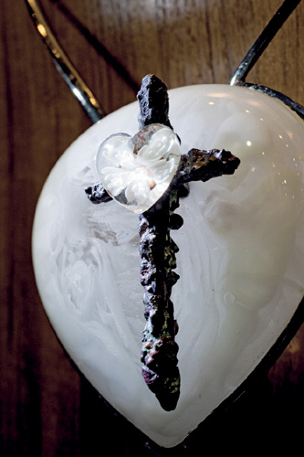 楊惠姍最新的大型觀念配飾創作〈勁綻放〉是對7位傑出女性生命的禮讚。代表德雷莎修女的配飾是一顆純白的愛心,琉紋流動其中,一支十字架看似累累斑痕,「腳沒有穿鞋,走過整個世界;一無所有,卻擁有最多的愛,」是楊惠姍心目中最偉大的女性。