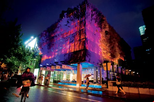 琉璃工房的「上海琉璃藝術博物館」外型獨特,由鋼絲搭建的二朵牡丹花瓣盤據玻璃帷幕,夜晚到來,光影變換,風采迷離。