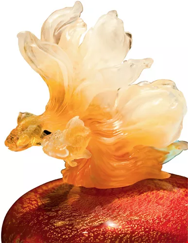楊惠姍的琉璃創作常以花朵游魚為主題,風格清麗靈秀。