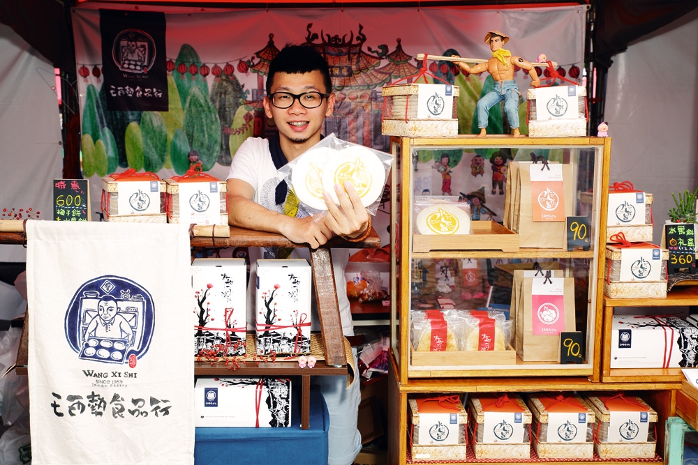 以烘焙產業專區為例,最搶眼的莫過於「王西勢食品」。藍底白字的旗招,搭配小型人偶裝飾,新潮中帶點古意的餅盒設計,連接待人員都有統一規格的小領巾,吸引大批人潮一探究竟。