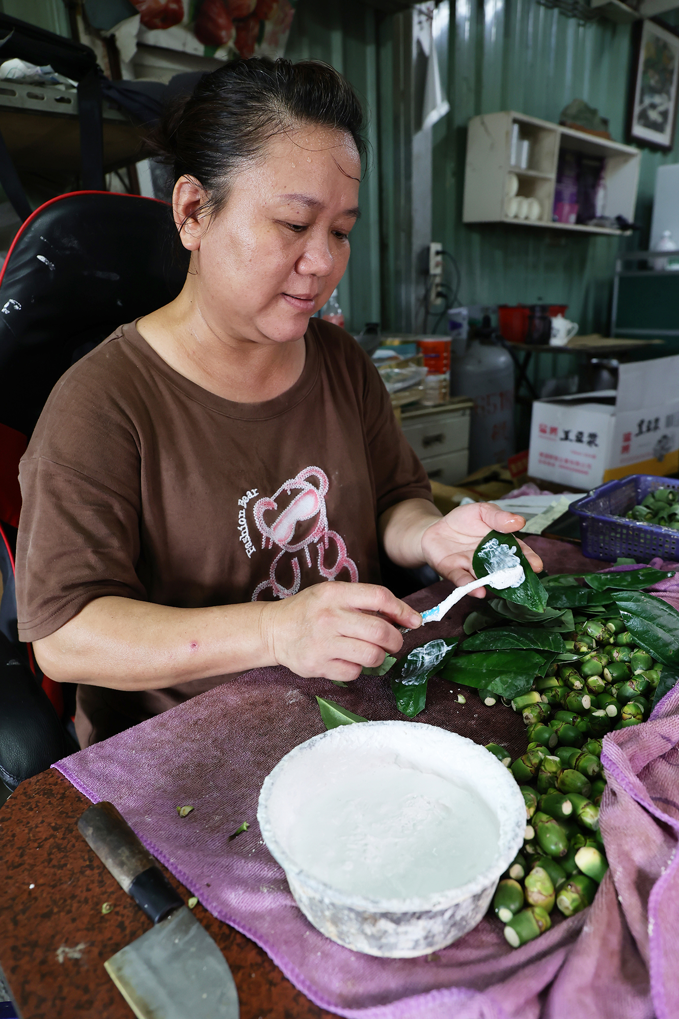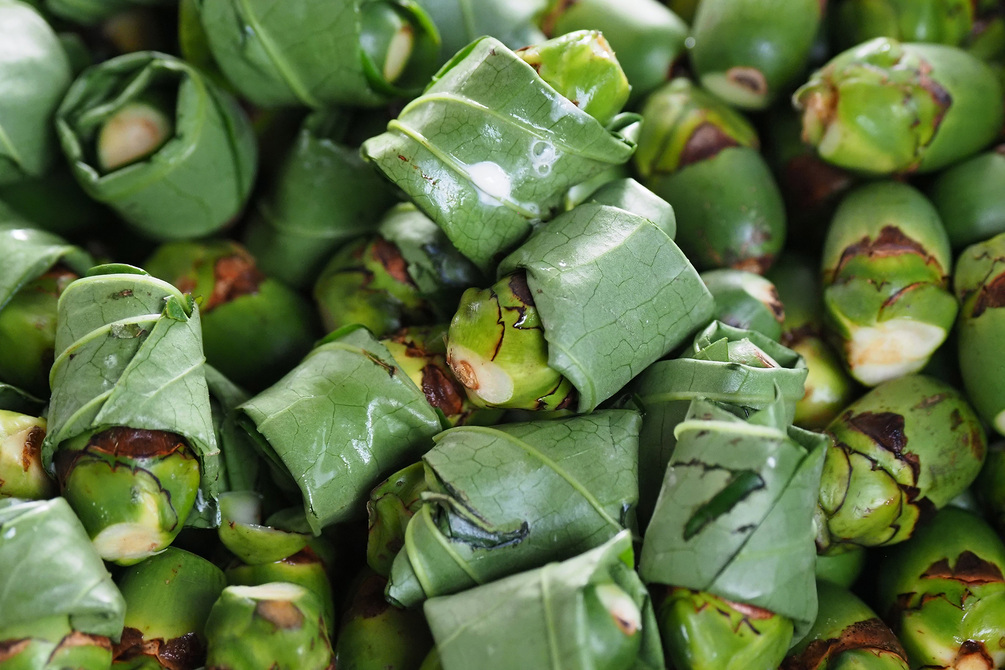 將檳榔籽切去頭部,荖葉上塗一層薄薄的熟石灰,對折後捲成形如戒指的環狀,再塞入檳榔,檳榔攤的老闆娘熟練地包著一顆顆的檳榔,這是台灣大街小巷林立的檳榔攤日常。但或許你會好奇,嚼食檳榔在人類的文明歷史有多久了?說來或許你會訝異,考古學家從出土的人類遺骸牙齒發現,人類嚼食檳榔塊的歷史至少5,000年。