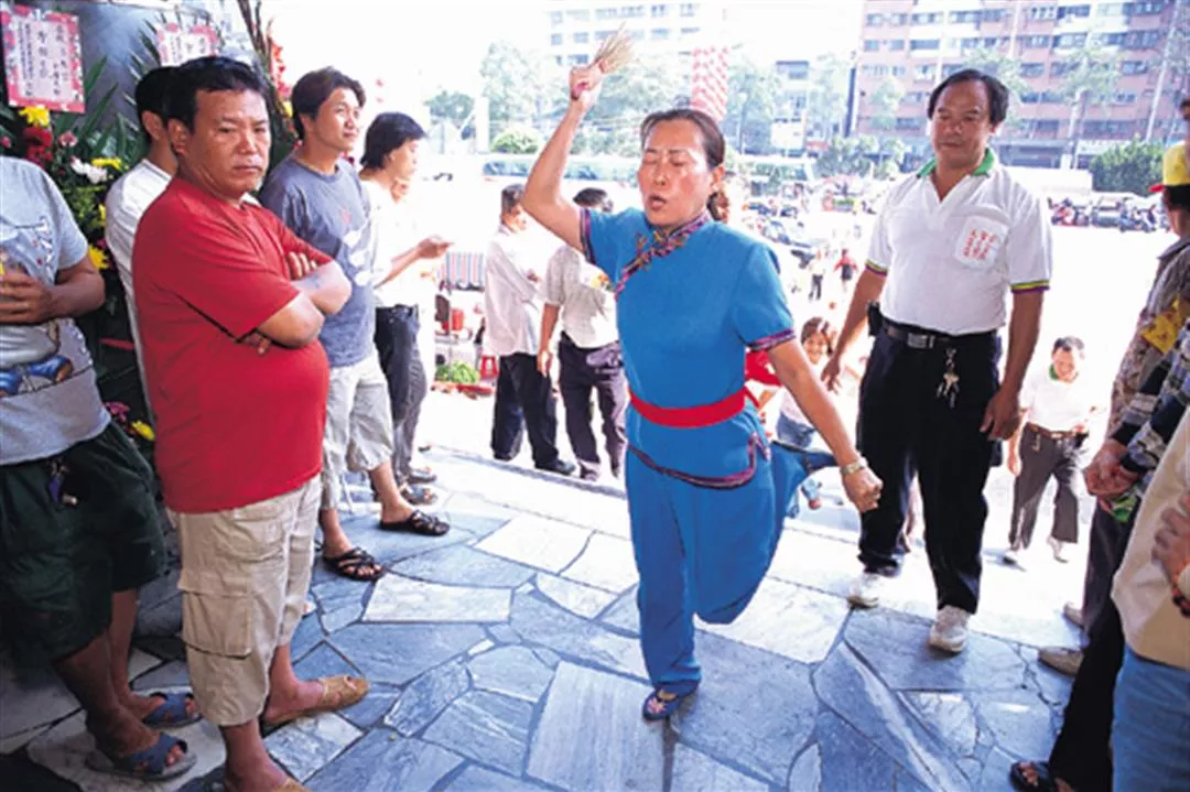三名乩童隨著熱烈的鑼鼓節奏,猛力地點頭,陪伴者拿著冒濃煙的香爐讓他們「吃香」,三個乩童逐漸進入一種恍惚入神的狀態。一個乩童開始拿起燃燒著的大香把,往臉上、身上劃過。觀看的歐巴桑不禁驚叫:「唉約,會燙死哦!」另一位乩童則任由陪伴人員在他的雙頰穿過六十公分的長針,最後一位乩童則操起鯊魚劍猛往背後砍去,鮮血一滴滴飛濺......。