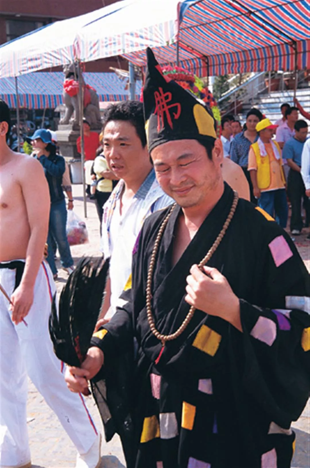 穿著一身補丁道袍的濟公,滿臉通紅,帶著一臉酩酊醉意,一手搖著蒲扇,一手拿著葫蘆酒瓶,搖頭晃腦地步上三鳳宮台階。一旁,來自另一座寺廟的女乩童,一身青色俠女裝,模擬三太子腳踩風火輪的姿勢,一手高舉,左腳提高,單憑右腳一口氣不間斷地跳上二十一級台階。