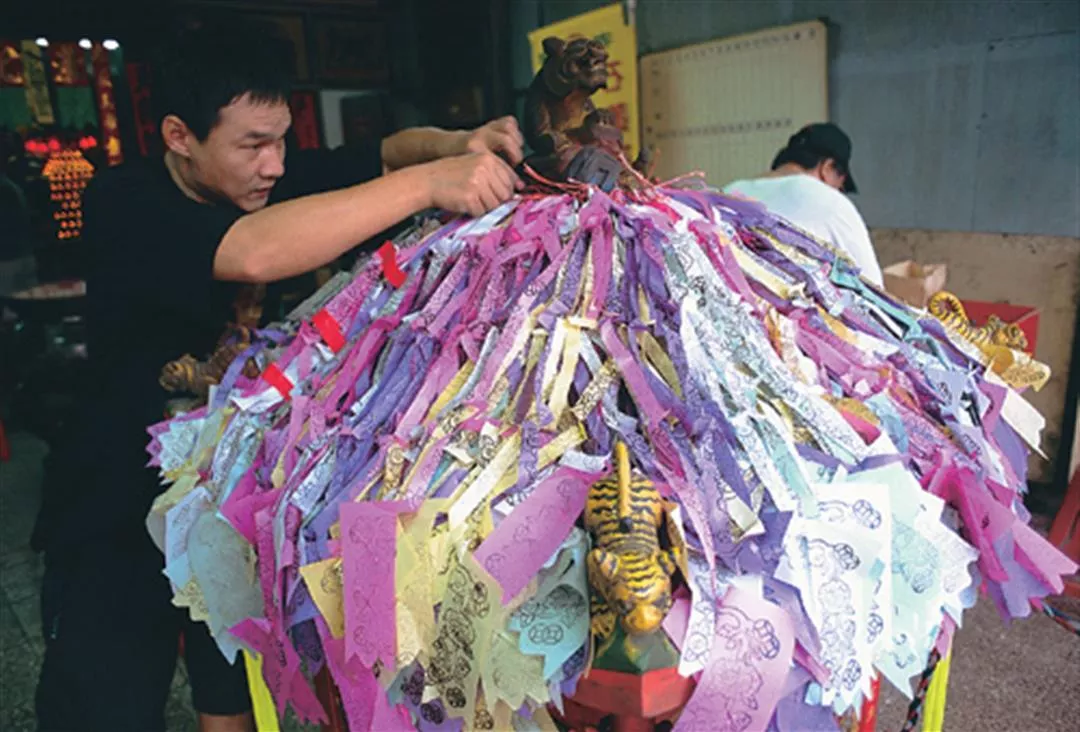 九月九日大清早,大門關閉的三鳳宮有了不同的布置,簷廊下掛滿紅色燈籠,排滿祝壽的花籃,十足過生日的喜氣洋洋。