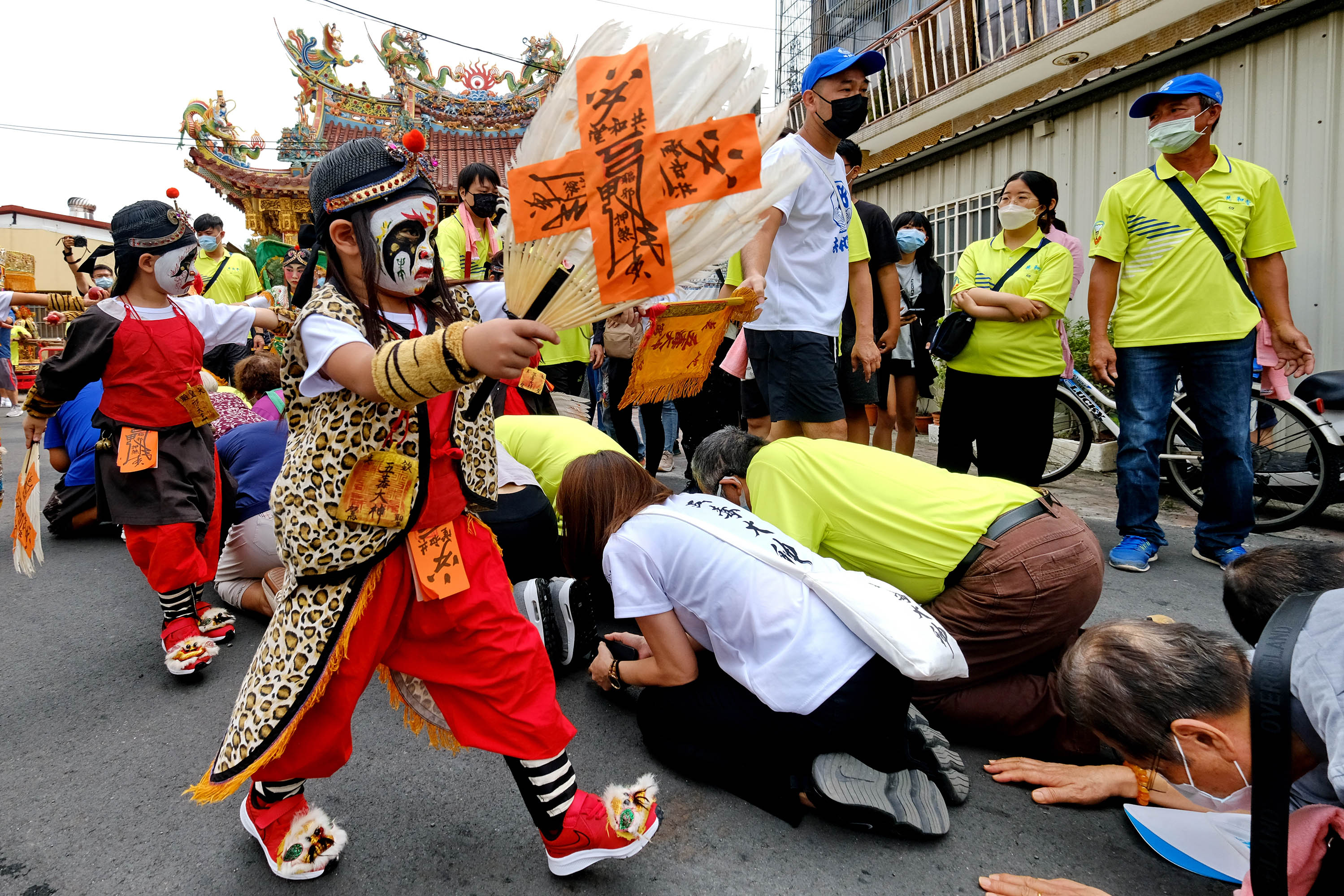圖為東港迎王平安祭典中,男孩化身五毒大神出巡,民眾跪拜迎接。