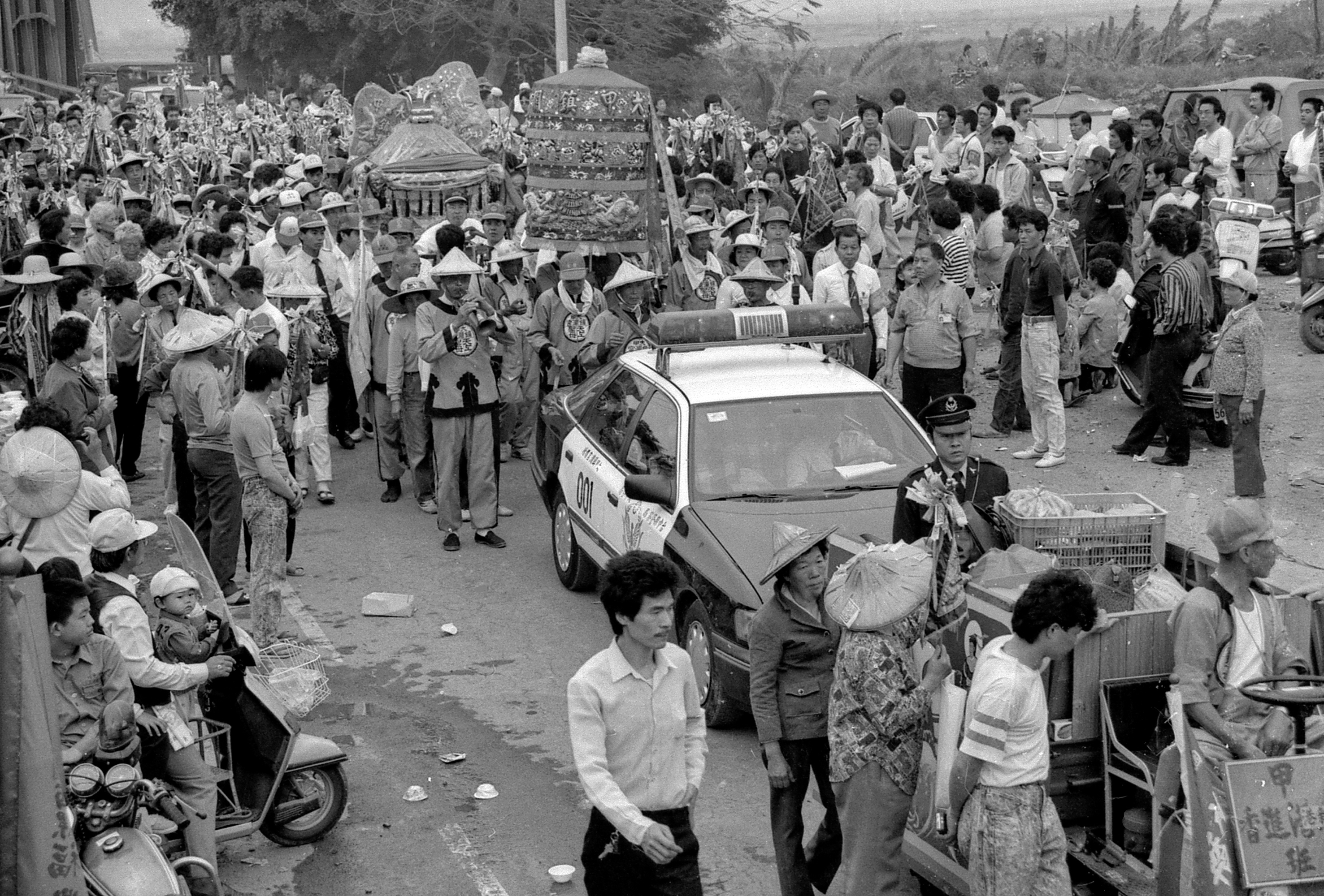 1990年,首次參與大甲媽祖遶境進香的陳逸宏,用黑白底片拍下農用車、警車,為神輿開路的純樸畫面。