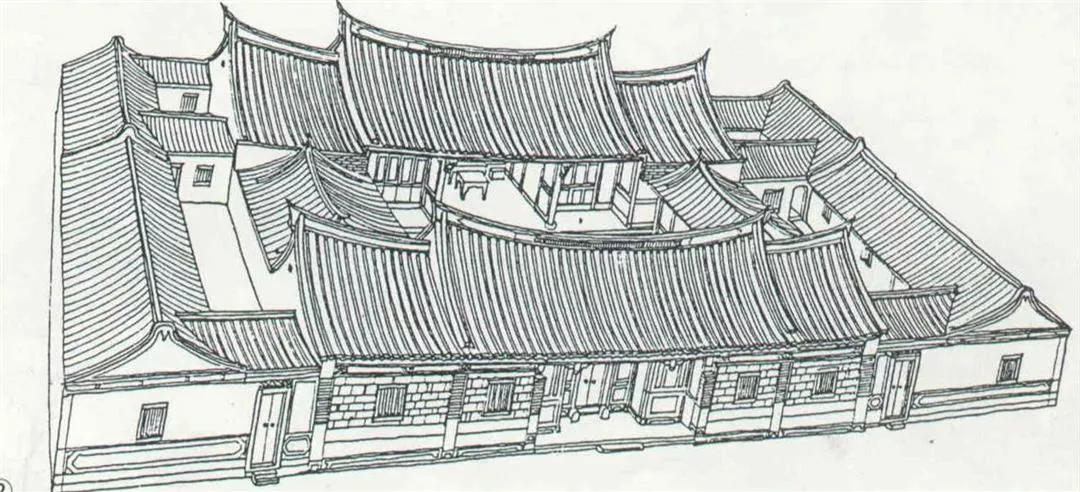 圖2.:這是林安泰古厝的立面全貌。(李乾朗繪。(楊永山/李乾朗)