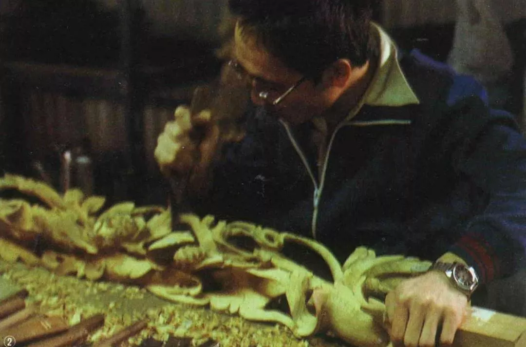 圖2.:師傅用檜木補雕損毀的部分。(楊永山/李乾朗)