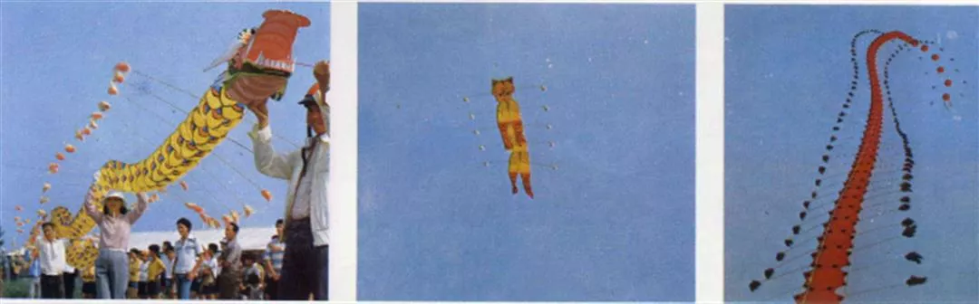 各式各樣的小型風箏,輕而易舉地便飛上了天空,悠遊翱翔。有些是翩然飛舞的蝴蝶,有些是搖曳生姿的美女,還有唯妙唯肖的老虎、青竹絲也在空中爭奇比巧。有的將竹削笛繫在箏首,迎風嘯鳴,更是別有一番情趣。
